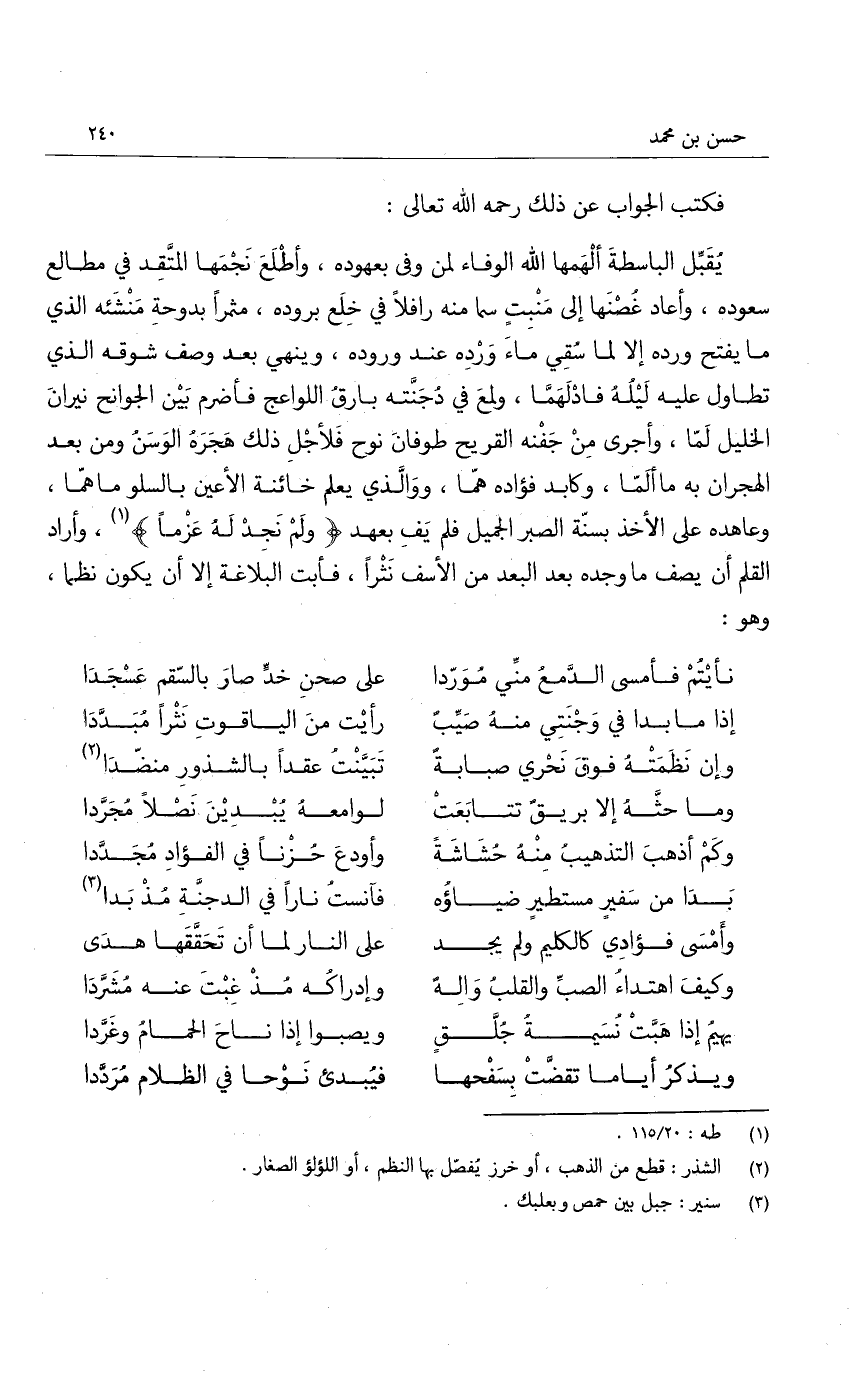 فكتب الجواب عن ذلك رحمه الله تعالى: يقبل الباسطة ألهمها الله الوفاء لمن وفى بعهوده، وأطلع نجمها المتقد في مطالع سعوده، وأعاد غصنها إلى منبت سما منه رافلاً في خلع بروده، مثمراً بدوحة منشئه الذي ما يفتح ورده إلا لما سقي ماء ورده عند وروده، وينهي بعد وصف شوقه الذي تطاول عليه ليله فادلهما، ولمع في دجنته بارق اللواعج فأضرم بين الجوانح نيران الخليل لما، وأجرى من جفنه القريح طوفان نوح فلأجل ذلك هجره الوسن ومن بعد الهجران به ما ألما، وكابد فؤاده هما، ووالذي يعلم خائنة الأعين بالسلو ما هما، وعاهده على الأخذ بسنة الصبر الجميل فلم يف بعهد " ولَمْ نَجِدْ لَهُ عَزْماً "، وأراد القلم أن يصف ما وجد بعد البعد من الأسف نثراً، فأبت البلاغة إلا أن يكون نظما، وهو: