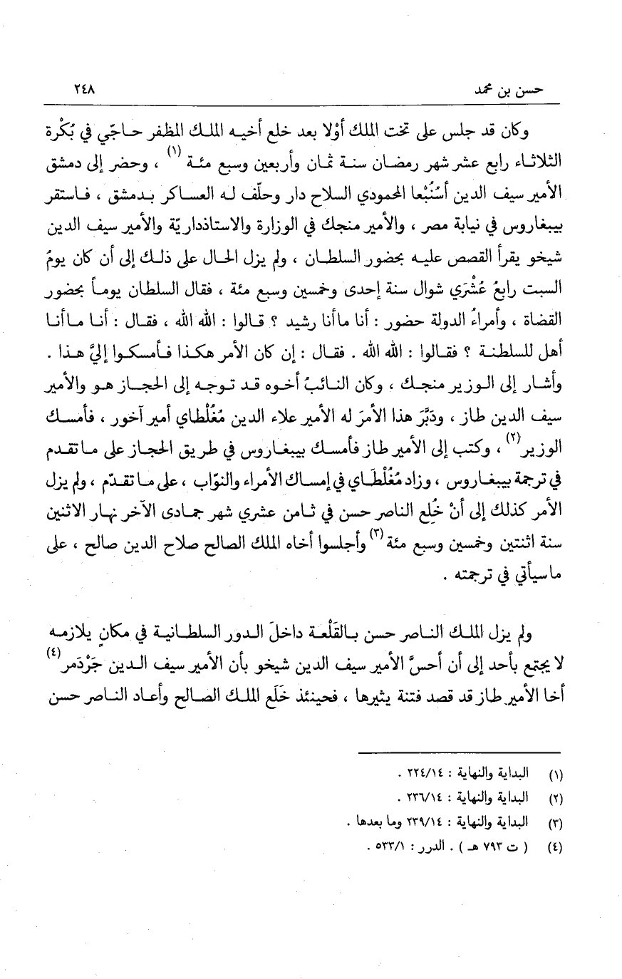 وكان قد جلس على تخت الملك أولا بعد خلع أخيه الملك المظفر حاجي في بكرة الثلاثاء رابع عشر شهر رمضان سنة ثمان وأربعين وسبع مئة، وحضر إلى دمشق الأمير سيف الدين أسنبعا المحمودي السلاح دار وحلف له العساكر بدمشق، فاستقر بيبغاروس في نيابة مصر، والأمير منجك في الوزارة والاستاذدارية والأمير سيف الدين شيخو يقرأ القصص عليه بحضور السلطان، ولم يزل الحال على ذلك إلى أن كان يوم السبت رابع عشري شوال سنة إحدى وخمسين وسبع مئة، فقال السلطان يوماً بحضور القضاة، وأمراء الدولة حضور: أنا ما أنا رشيد؟ قالوا: الله الله، فقال: أنا ما أنا أهل للسلطنة؟ فقالوا: الله الله. فقال: إن كان الأمر هكذا فأمسكوا إلي هذا. وأشار إلى الوزير منجك، وكان النائب أخوه قد توجه إلى الحجاز هو والأمير سيف الدين طاز، ودبر هذا الأمر له الأمير علاء الدين مغلطاي أمير آخور، فأمسك الوزير، وكتب إلى الأمير طاز فأمسك بيبغاروس في طريق الحجاز على ما تقدم في ترجمة بيبغاروس، وزاد مغلطاي في إمساك الأمراء والنواب، على ما تقدم، ولم يزل الأمر كذلك إلى أن خلع الناصر حسن في ثامن عشري شهر جمادى الآخر نهار الاثنين سنة اثنتين وخمسين وسبع مئة وأجلسوا أخاه الملك الصالح صلاح الدين صالح، على ما سيأتي في ترجمته.