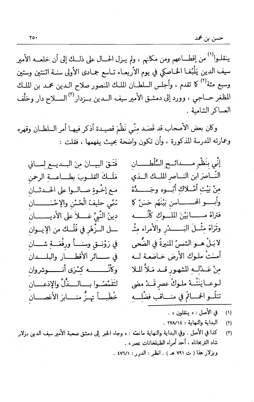 وكان بعض الأصحاب قد قصد مني نظم قصيدة أذكر فيها أمر السلطان وقهره وعمارته المدرسة المذكورة، وأن تكون واضحة بحيث يفهمها، فقلت: