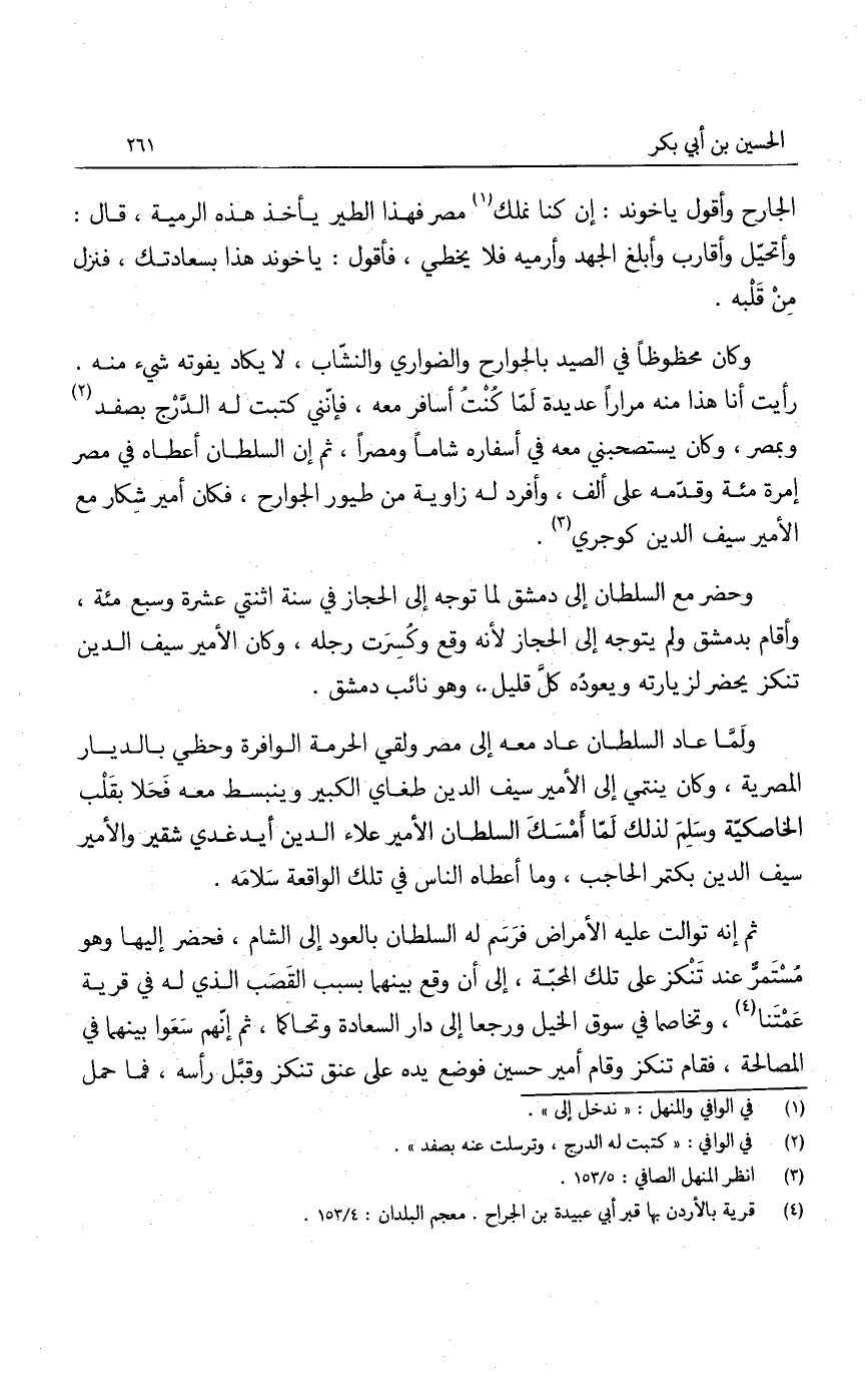 وكان محظوظاً في الصيد بالجوارح والضواري والنشاب، لا يكاد يفوته شيء منه. رأيت أنا هذا منه مراراً عديدة لما كنت أسافر معه، فإنني كتبت له الدرج بصفد وبمصر، وكان يستصحبني معه في أسفاره شاماً ومصراً، ثم إن السلطان أعطاه في مصر إمرة مئة وقدمه عل ألف، وأفرد له زاوية من طيور الجوارح، فكان أمير شكار مع الأمير سيف الدين كوجري.