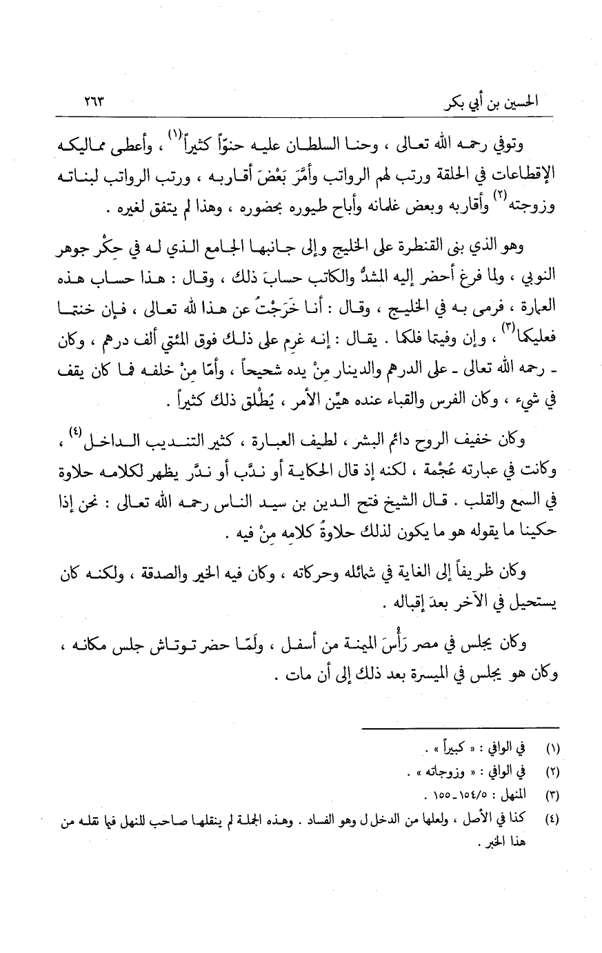 وهو الذي بنى القنطرة على الخليج وإلى جانبها الجامع الذي له في حكر جوهر النوبي، ولما فرغ أحضر إليه المشد والكاتب حساب ذلك، وقال: هذا حساب هذه العمارة، فرمى به في الخليج، وقال: أنا خرجت عن هذا لله تعالى، فإن خنتما فعليكما، وإن وفيتما فلكما. يقال: إنه غرم على ذلك فوق المئتي ألف درهم، وكان - رحمه الله تعالى - على الدرهم والدينار من يده شحيحاً، وأما من خلفه فما كان يقف في شيء، وكان الفرس والقباء عنده هين الأمر، يطلق ذلك كثيراً.
