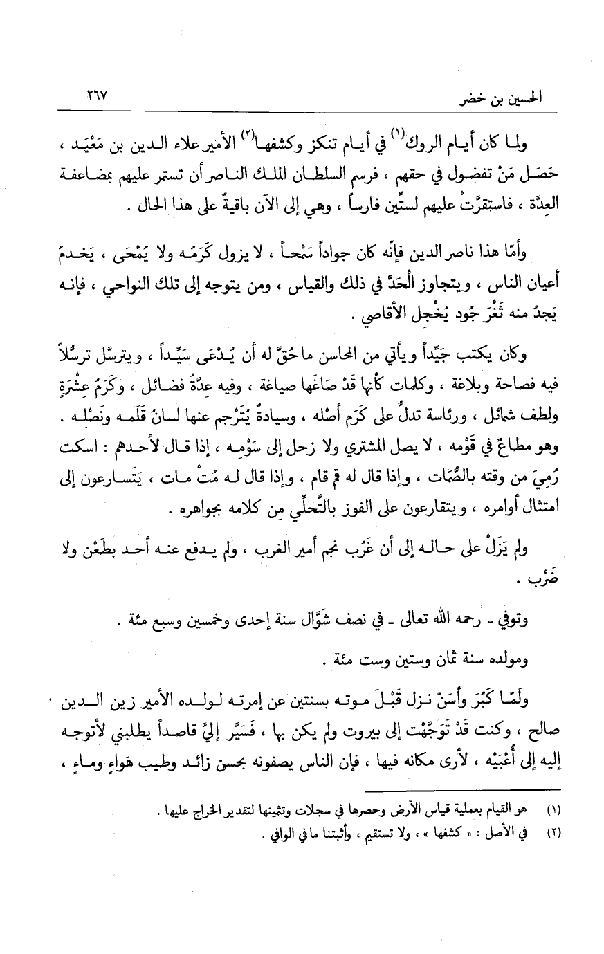 ولما كبر وأسن نزل قبل موته بسنتين عن إمرته لولده الأمير زين الدين صالح، وكنت قد توجهت إلى بيروت ولم يكن بها، فسير إلي قاصداً يطلبني لأتوجه إليه إلى أعبيه، لأرى مكانه فيها، فإن الناس يصفونه بحسن زائد وطيب هواء وماء،