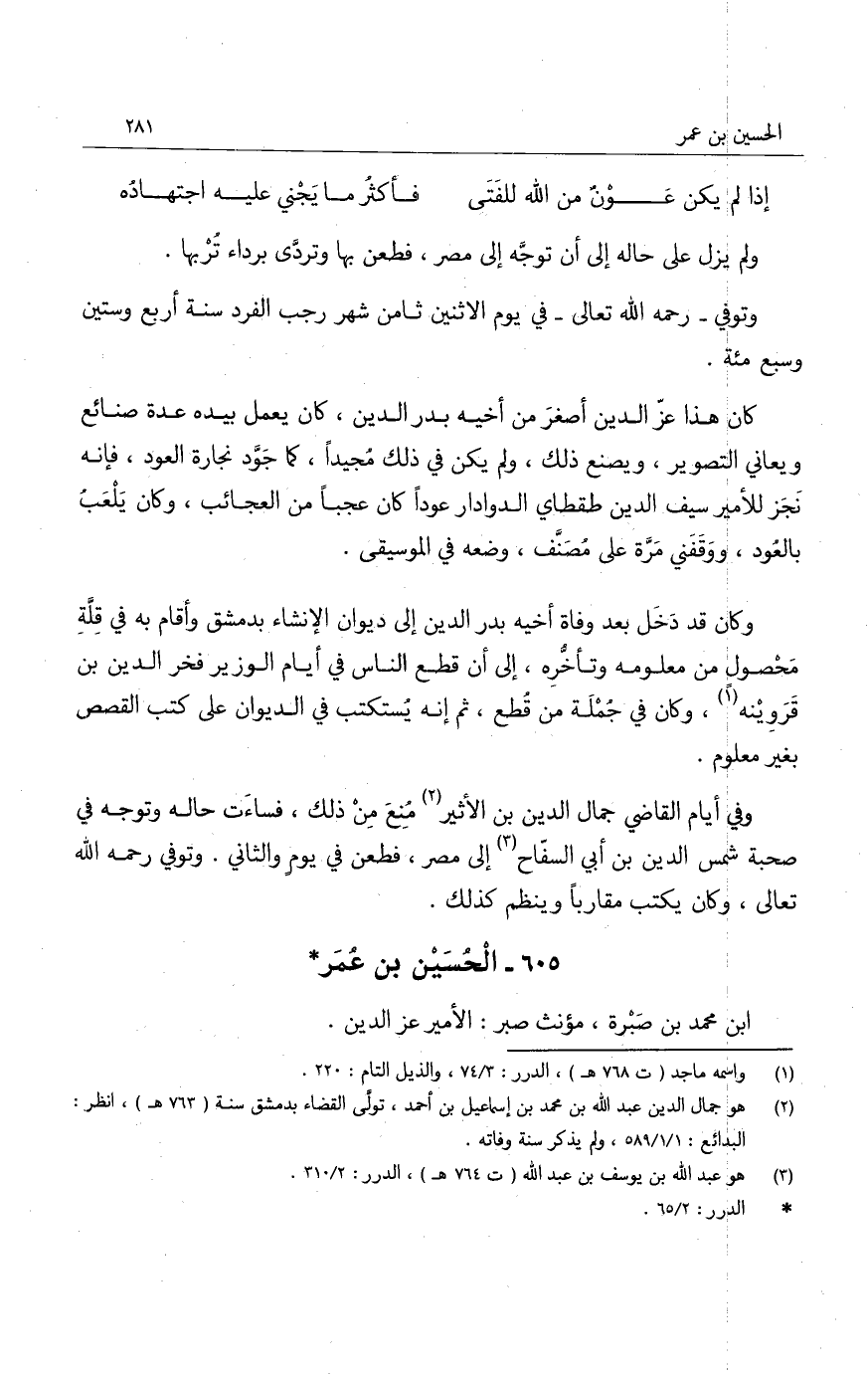 كان هذا عز الدين أصغر من أخيه بدر الدين، كان يعمل بيده عدة صنائع ويعاني التصوير، ويصنع ذلك، ولم يكن في ذلك مجيداً، كما جود نجارة العود، فإنه نجز للأمير سيف الدين طقطاي الدوادار عوداً كان عجباً من العجائب، وكان يلعب بالعود، ووقفني مرة على مصنف، وضعه في الموسيقى.
