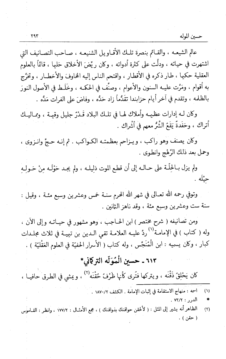 عالم الشيعه، والقائم بنصرة تلك الأقاويل الشنيعه، صاحب التصانيف التي اشتهرت في حياته، ودلت على كثرة أدواته، وكان ريض الأخلاق حليما، قائماً بالعلوم العقلية حكيما، طار ذكره في الأقطار، واقتحم الناس إليه المخاوف والأخطار، وتخرج به أقوام، ومرت عليه السنون والأعوام، وصنف في الحكمه، وخلط في الأصول النور بالظلمه، وتقدم في آخر أيام حزابندا تقدماً زاد حده، وفاض على الفرات مده.