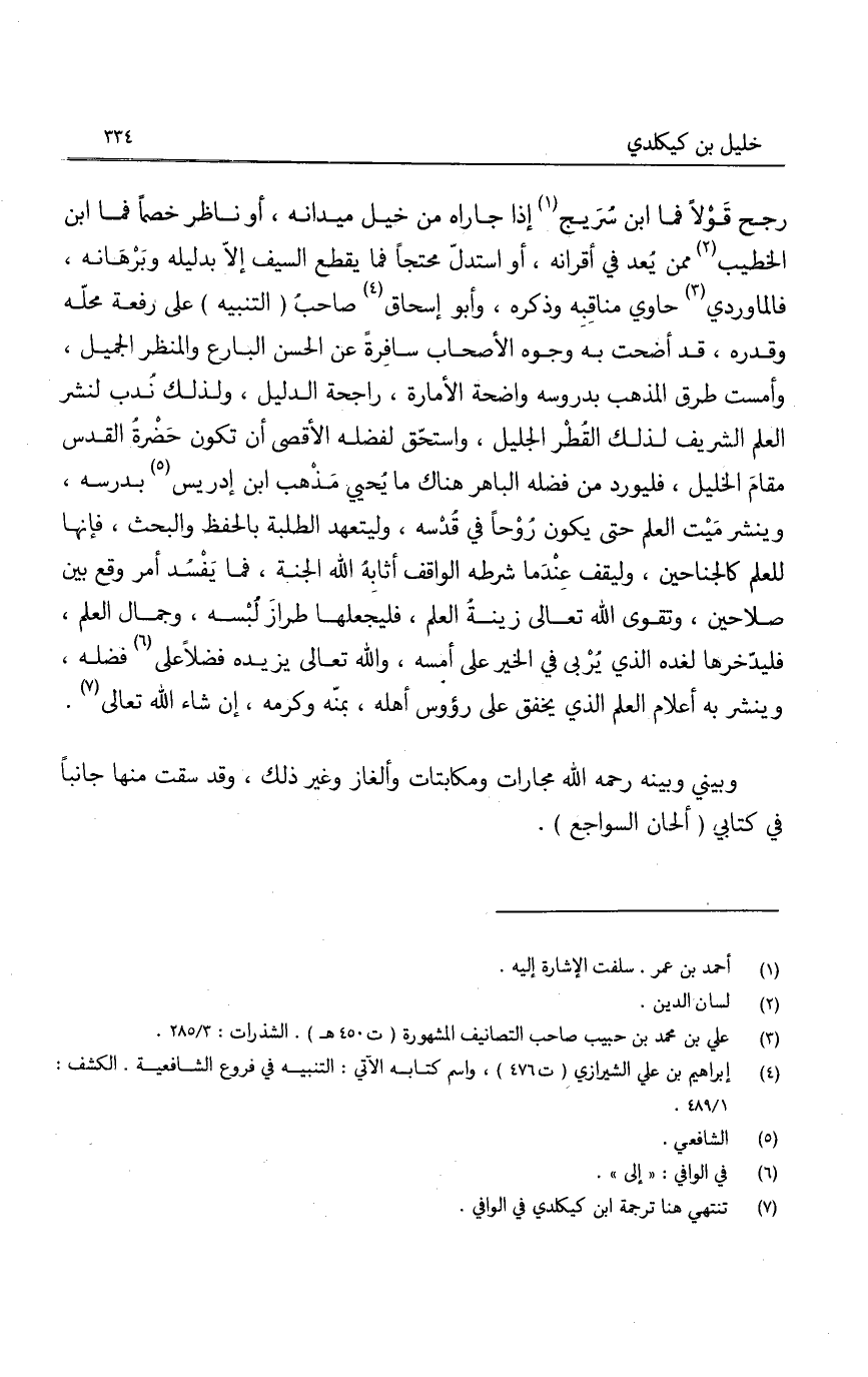 رجح قولاً فما ابن سريج إذا جاراه من خيل ميدانه، أو ناظر خصماً فما ابن الخطيب ممن يعد في أقرانه، أو استدل محتجاً فما يقطع السيف إلا بدليله وبرهانه، فالماوردي حاوي مناقبه وذكره، وأبو إسحاق صاحب التنبيه على رفعة محله وقدره، قد أضحت به وجوه الأصحاب سافرةً عن الحسن البارع والمنظر الجميل، وأمست طرق المذهب بدروسه واضحة الأمارة، راجحة الدليل، ولذلك ندب لنشر العلم الشريف لذلك القطر الجليل، واستحق لفضله الأقصى أن تكون حضرة القدس مقام الخليل، فليورد من فضله الباهر هناك ما يحيي مذهب ابن إدريس بدرسه، وينشر ميت العلم حتى يكون روحاً في قدسه، وليتعهد الطلبة بالحفظ والبحث، فإنها للعلم كالجناحين، وليقف عندما شرطه الواقف أثابه الله الجنة، فما يفسد أمر وقع بين صلاحين، وتقوى الله تعالى زينة العلم، فليجعلها طراز لبسه، وجمال العلم، فليدخرها لغده الذي يربى في الخير على أمسه، والله تعالى يزيده فضلاً على فضله، وينشر به أعلام العلم الذي يخفق على رؤوس أهله، بمنه وكرمه، إن شاء الله تعالى.