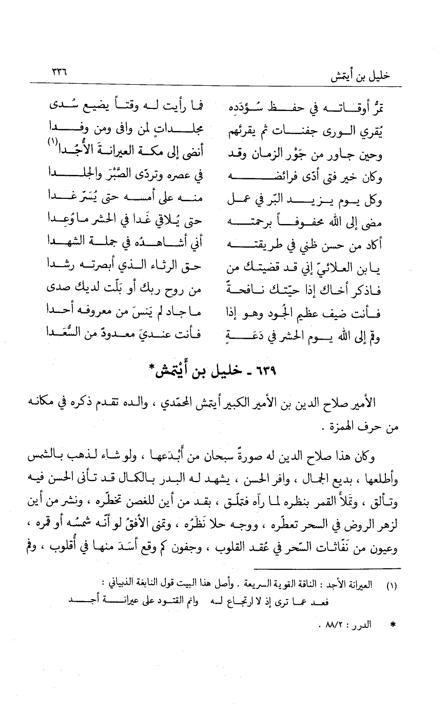 وكان هذا صلاح الدين له صورة سبحان من أبدعها، ولو شاء لذهب بالشمس وأطلعها، بديع الجمال، وافر الحسن، يشهد له البدر بالكمال قد تأنى الحسن فيه وتألق، وتملأ القمر بنظره لما رآه فتملق، بقد من أين للغصن تخطره، ونشر من أين لزهر الروض في السحر تعطره، ووجه حلا نظره، وتمنى الأفق لو أنه شمسه أو قمره، وعيون من نفاثات السحر في عقد القلوب، وجفون كم وقع أسد منها في أقلوب، وفم
