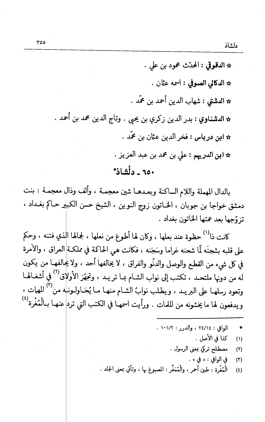 بالدال المهملة واللام الساكنة وبعدها شين معجمة، وألف وذال معجمة: بنت دمشق خواجا بن جوبان، الخاتون زوج النوين، الشيخ حسن الكبير حاكم بغداد، تزوجها بعد عمتها الخاتون بغداد.