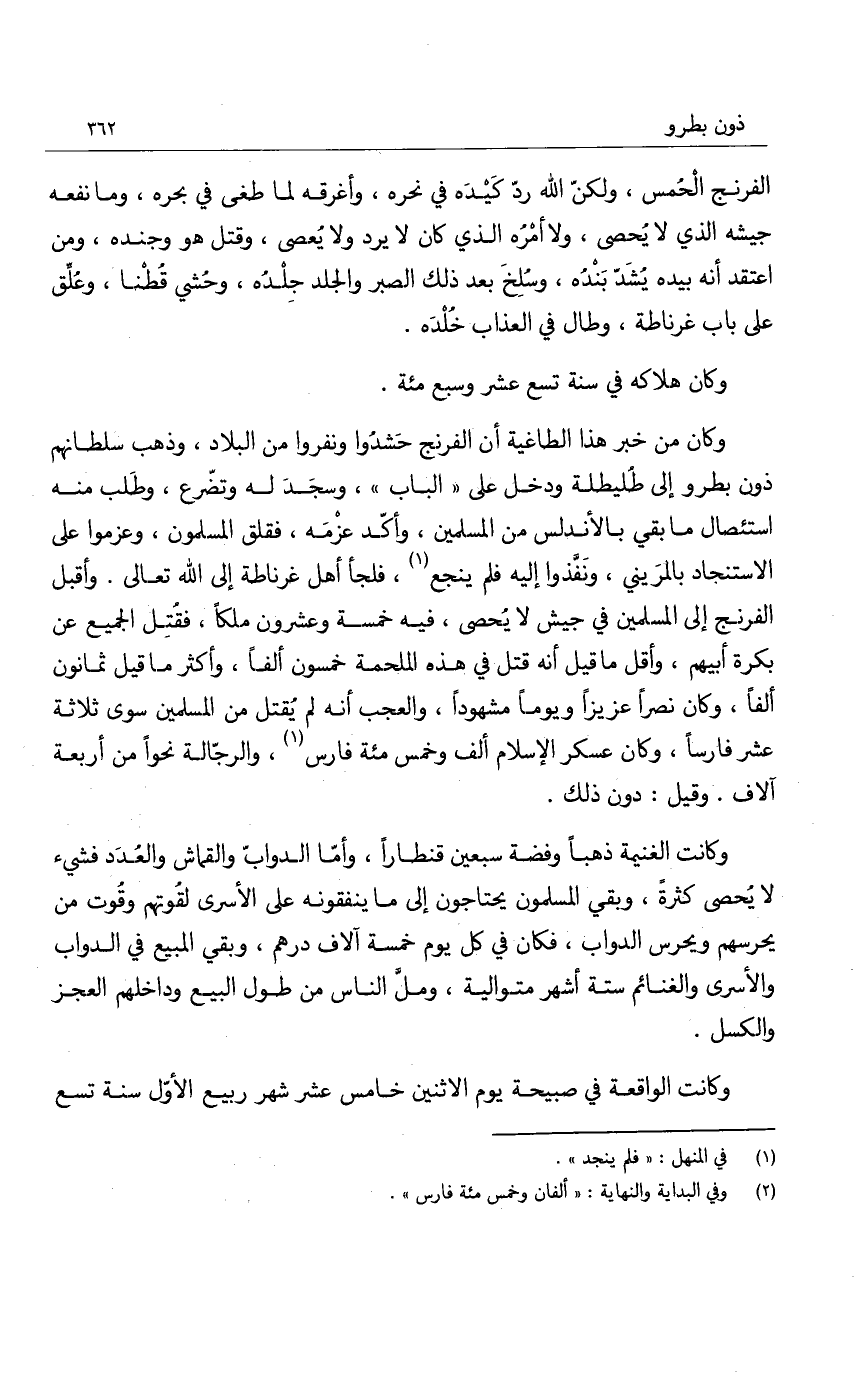وكان من خبر هذا الطاغية أن الفرنج حشدوا ونفروا من البلاد، وذهب سلطانهم ذون بطرو إلى طليطلة ودخل على الباب، وسجد له وتضرع، وطلب منه استئصال ما بقي بالأندلس من المسلمين، وأكد عزمه، فقلق المسلمون، وعزموا على الاستنجاد بالمريني، ونفذوا إليه فلم ينجع، فلجأ أهل غرناطة إلى الله تعالى. وأقبل الفرنج إلى المسلمين في جيش لا يحصى، فيه خمسة وعشرون ملكاً، فقتل الجميع عن بكرة أبيهم، وأقل ما قيل أنه قتل في هذه الملحمة خمسون ألفاً، وأكثر ما قيل ثمانون ألفاً، وكان نصراً عزيزاً ويوماً مشهوداً، والعجب أنه لم يقتل من المسلمين سوى ثلاثة عشر فارساً، وكان عسكر الإسلام ألف وخمس مئة فارس، والرجالة نحواً من أربعة آلاف. وقيل: دون ذلك.