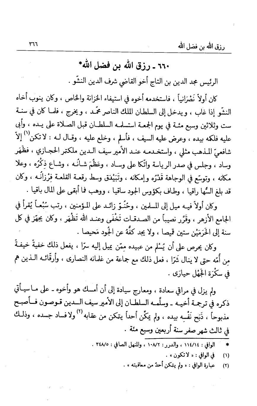 ولم يزل في مراقي سعادة، ومعارج سيادة إلى أن أمسك هو وأخوه - على ما سيأتي ذكره في ترجمة أخيه - وسلمه السلطان إلى الأمير سيف الدين قوصون فأصبح مذبوحاً، ذبح نفسه بيده، ولم يمكن أحداً يتمكن من عقابه ولا فساد جسده، وذلك في ثالث شهر صفر سنة أربعين وسبع مئة.