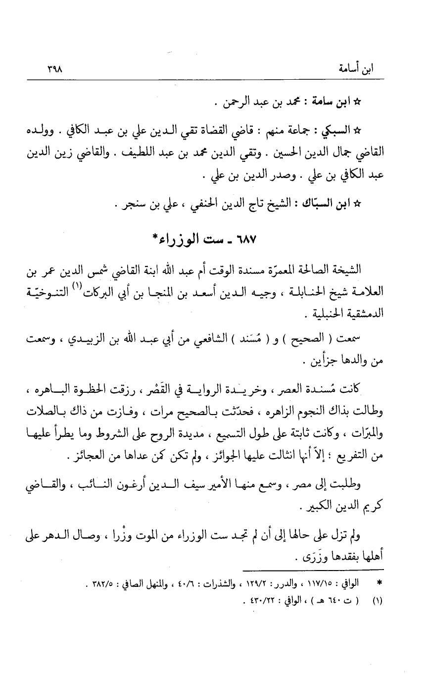 كانت مسندة العصر، وخريدة الرواية في القصر، رزقت الحظوة الباهره، وطالت بذاك النجوم الزاهره، فحدثت بالصحيح مرات، وفازت من ذاك بالصلات والمبرات، وكانت ثابتة على طول التسميع، مديدة الروح على الشروط وما يطرأ عليها من التفريع؛ إلا أنها انثالت عليها الجوائز، ولم تكن كمن عداها من العجائز.
