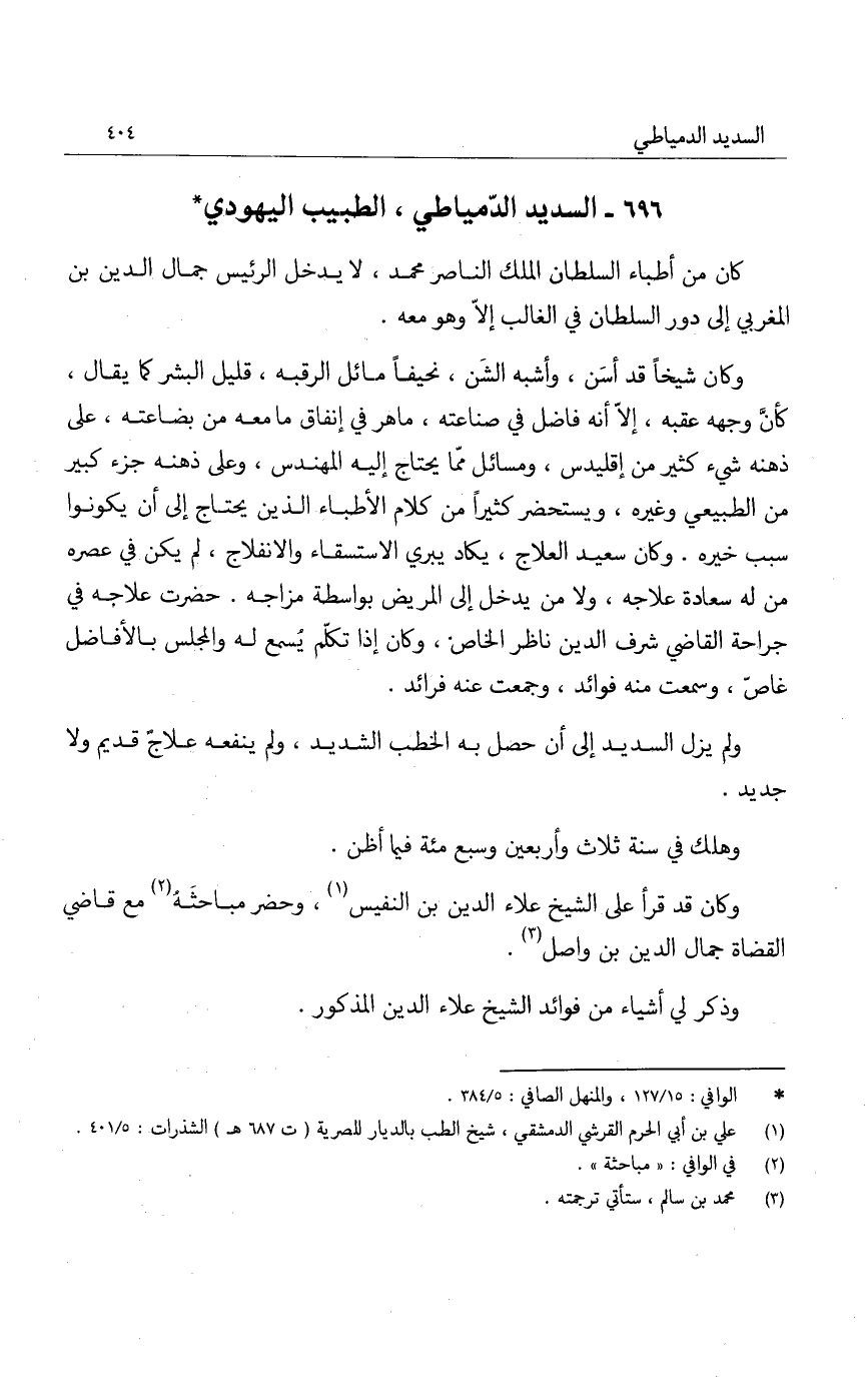 وكان شيخاً قد أسن، وأشبه الشن، نحيفاً مائل الرقبه، قليل البشر كما يقال، كأن وجهه عقبه، إلا أنه فاضل في صناعته، ماهر في إنفاق ما معه من بضاعته، على ذهنه شيء كثير من إقليدس، ومسائل مما يحتاج إليه المهندس، وعلى ذهنه جزء كبير من الطبيعي وغيره، ويستحضر كثيراً من كلام الأطباء الذين يحتاج إلى أن يكونوا سبب خيره. وكان سعيد العلاج، يكاد يبري الاستسقاء والانفلاج، لم يكن في عصره من له سعادة علاجه، ولا من يدخل إلى المريض بواسطة مزاجه. حضرت علاجه في جراحة القاضي شرف الدين ناظر الخاص، وكان إذا تكلم يسمع له والمجلس بالأفاضل غاص، وسمعت منه فوائد، وجمعت عنه فرائد.