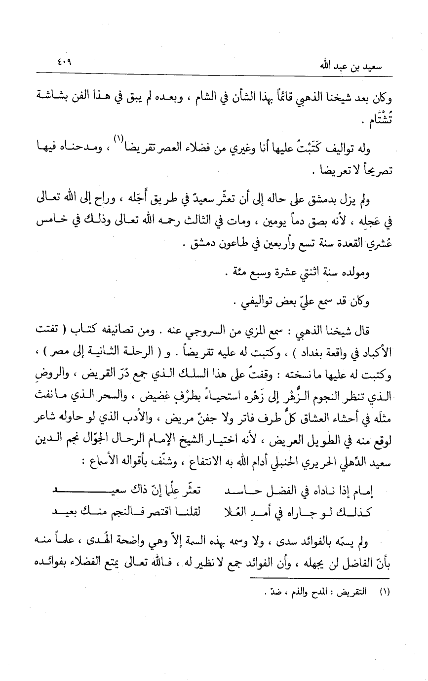 قال شيخنا الذهبي: سمع المزي من السروجي عنه. ومن تصانيفه كتاب تفتت الأكباد في واقعة بغداد، وكتبت له عليه تقريضاً. والرحلة الثانية إلى مصر، وكتبت له عليها ما نسخته: وقفت على هذا السلك الذي جمع در القريض، والروض الذي تنظر النجوم الزهر إلى زهره استحياءً بطرف غضيض، والسحر الذي ما نفث مثله في أحشاء العشاق كل طرف فاتر ولا جفن مريض، والأدب الذي لو حاوله شاعر لوقع منه في الطويل العريض، لأنه اختيار الشيخ الإمام الرحال الجوال نجم الدين سعيد الدهلي الحريري الحنبلي أدام الله به الانتفاع، وشنف بأقواله الأسماع: