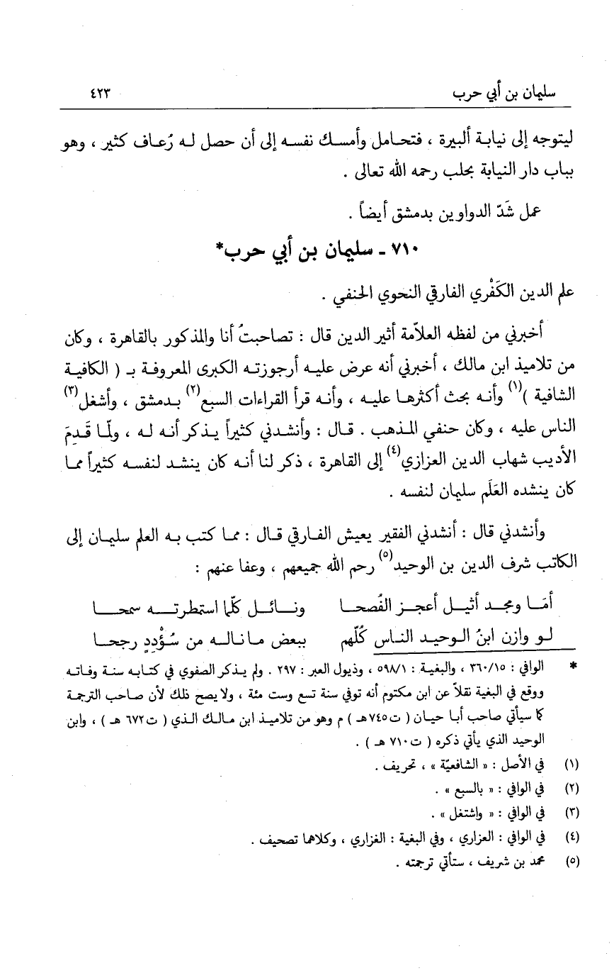 أخبرني من لفظه العلامة أثير الدين قال: تصاحبت أنا والمذكور بالقاهرة، وكان من تلاميذ ابن مالك، أخبرني أنه عرض عليه أرجوزته الكبرى المعروفة بالكافية الشافية وأنه بحث أكثرها عليه، وأنه قرأ القراءات السبع بدمشق، وأشغل الناس عليه، وكان حنفي المذهب. قال: وأنشدني كثيراً يذكر أنه له، ولما قدم الأديب شهاب الدين العزازي إلى القاهرة، ذكر لنا أنه كان ينشد لنفسه كثيراً مما كان ينشده العلم سليمان لنفسه.