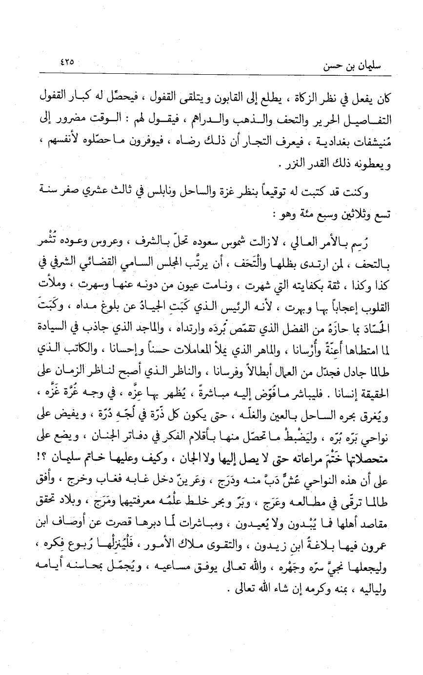كان يفعل في نظر الزكاة، يطلع إلى القابون ويتلقى القفول، فيحصل له كبار القفول التفاصيل الحرير والتحف والذهب والدراهم، فيقول لهم: الوقت مضرور إلى منيشفات بغدادية، فيعرف التجار أن ذلك رضاه، فيوفرون ما حصلوه لأنفسهم، ويعطونه ذلك القدر النزر.