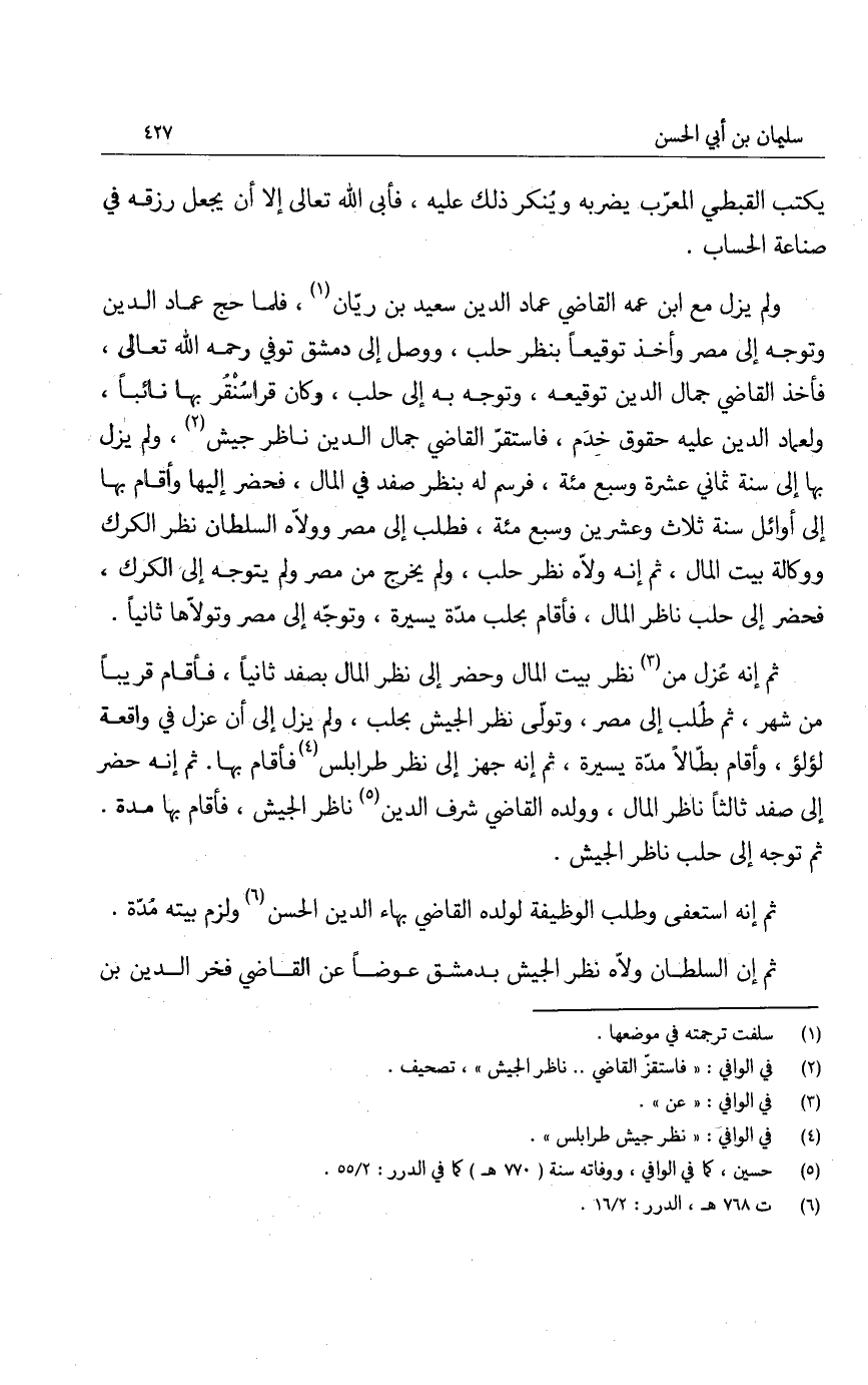 ولم يزل مع ابن عمه القاضي عماد الدين سعيد بن ريان، فلما حج عماد الدين وتوجه إلى مصر وأخذ توقيعاً بنظر حلب، ووصل إلى دمشق توفي رحمه الله تعالى، فأخذ القاضي جمال الدين توقيعه، وتوجه به إلى حلب، وكان قراسنقر بها نائباً، ولعماد الدين عليه حقوق خدم، فاستقر القاضي جمال الدين ناظر جيش، ولم يزل بها إلى سنة ثماني عشرة وسبع مئة، فرسم له بنظر صفد في المال، فحضر إليها وأقام بها إلى أوائل سنة ثلاث وعشرين وسبع مئة، فطلب إلى مصر وولاه السلطان نظر الكرك ووكالة بيت المال، ثم إنه ولاه نظر حلب، ولم يخرج من مصر ولم يتوجه إلى الكرك، فحضر إلى حلب ناظر المال، فأقام بحلب مدة يسية، وتوجه إلى مصر وتولاها ثانياً.