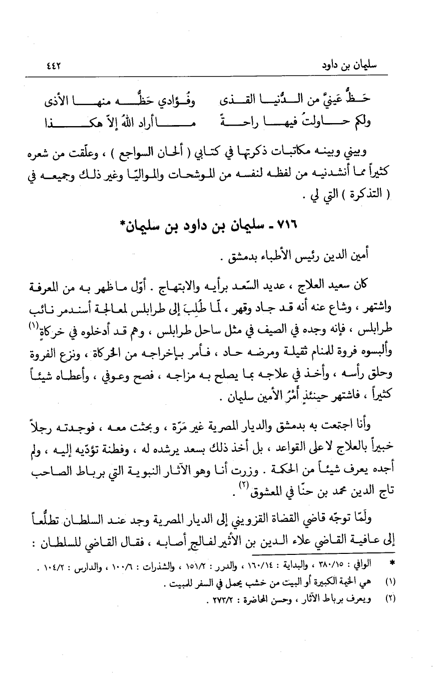وأنا اجتمعت به بدمشق والديار المصرية غير مرة، وبحثت معه، فوجدته رجلاً خبيراً بالعلاج لا على القواعد، بل أخذ ذلك بسعد يرشده له، وفطنة تؤديه إليه، ولم أجده يعرف شيئاً من الحكمة. وزرت أنا وهو الآثار النبوية التي برباط الصاحب تاج الدين محمد بن حنا في المعشوق.