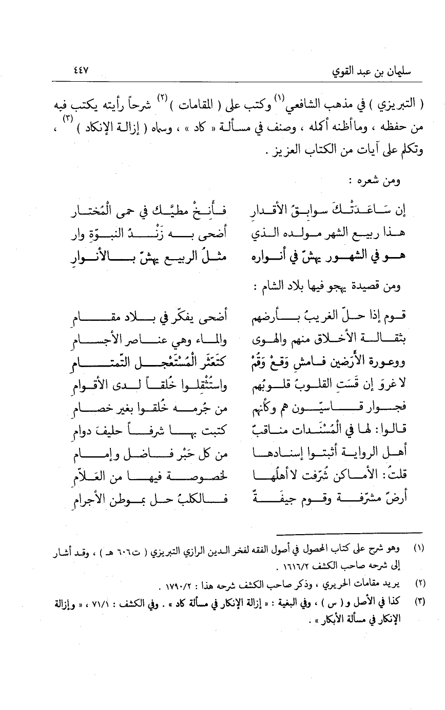 التبريزي في مذهب الشافعي وكتب على المقامات شرحاً رأيته يكتب فيه من حفظه، وما أظنه أكمله، وصنف في مسألة كاد، وسماه إزالة الإنكاد، وتكلم على آيات من الكتاب العزيز.