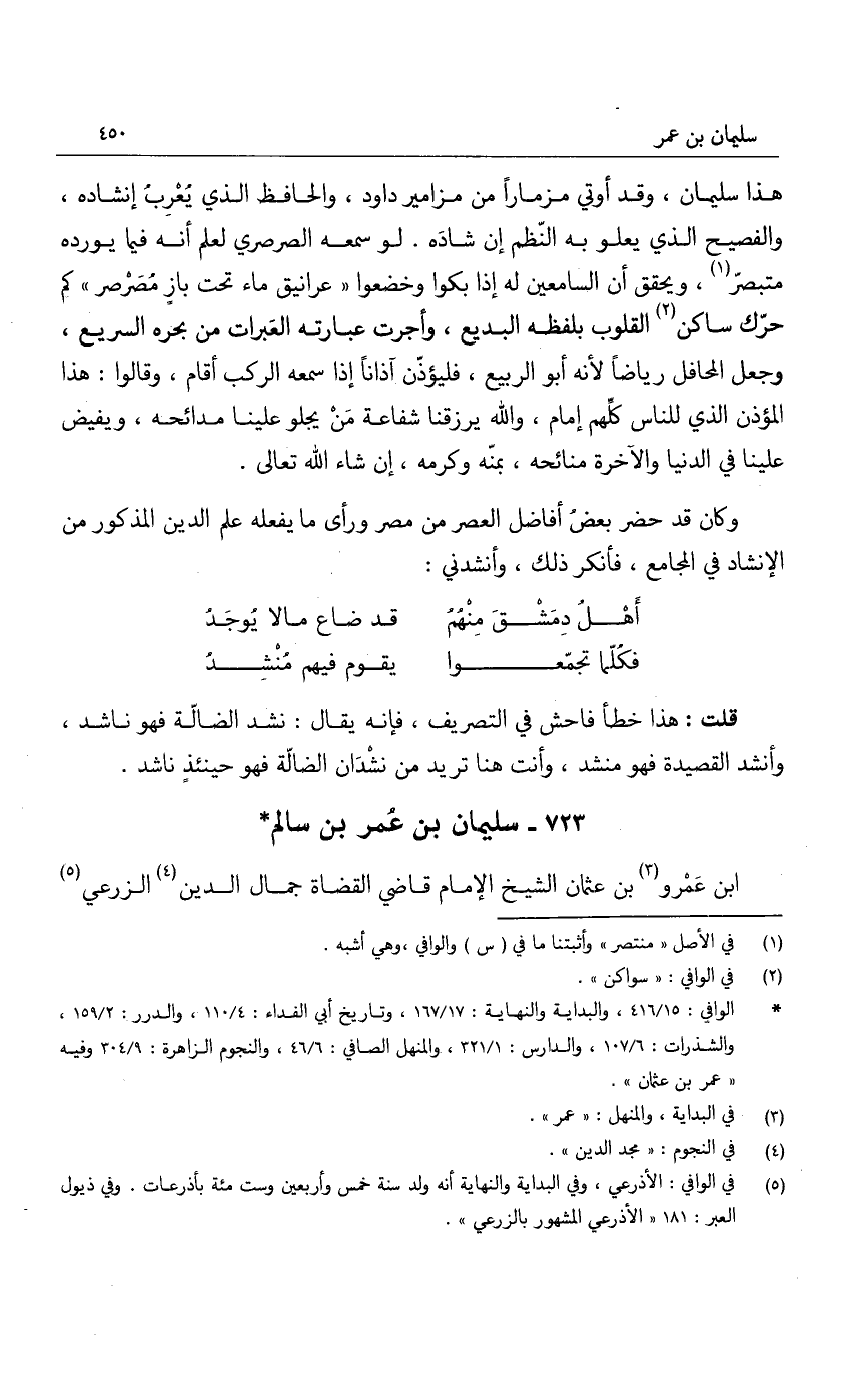 هذا سليمان: وقد أوتي مزماراً من مزامير داود، والحافظ الذي يعرب إنشاده، والفصيح الذي يعلو به النظم إن شاده. لو سمعه الصرصري لعلم أنه فيما يورده متبصر، ويحقق أن السامعين له إذا بكوا وخضعوا عرانيق ماء تحت باز مصرصر كم حرك ساكن القلوب بلفظه البديع، وأجرت عبارته العبرات من بحره السريع، وجعل المحافل رياضاً لأنه أبو الربيع، فليؤذن آذاناً إذا سمعه الركب أقام، وقالوا: هذا المؤذن الذي للناس كلهم إمام، والله يرزقنا شفاعة من يجلو علينا مدائحه، ويفيض علينا في الدنيا والآخرة منائحه، بمنه وكرمه، إن شاء الله تعالى.