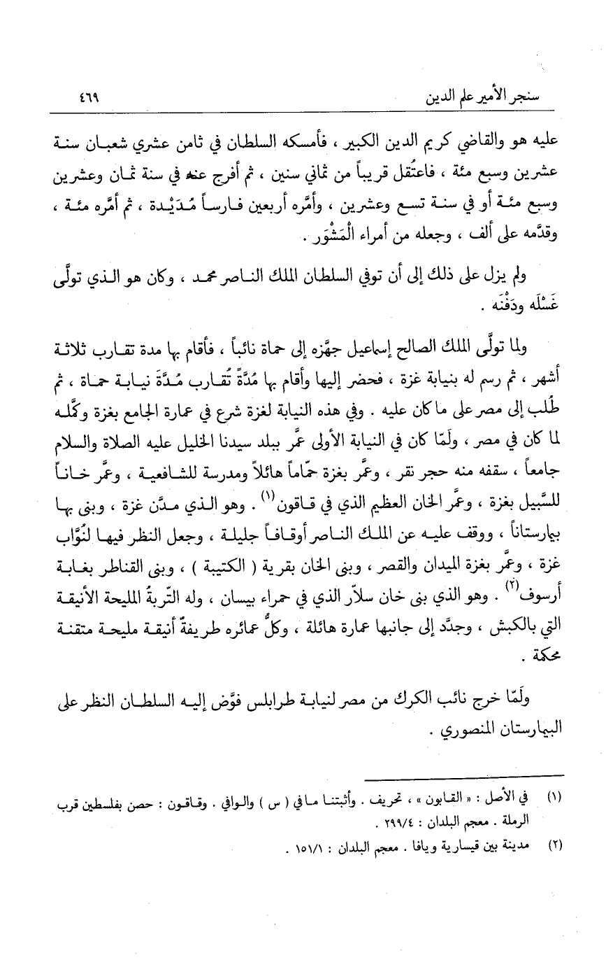 ولما تولى الملك الصالح إسماعيل جهزه إلى حماة نائباً، فأقام بها مدة تقارب ثلاثة أشهر، ثم رسم له بنيابة غزة، فحضر إليها وأقام بها مدةً تقارب مدة نيابة حماة، ثم طلب إلى مصر على ما كان عليه. وفي هذه النيابة لغزة شرع في عمارة الجامع بغزة وكمله لما كان في مصر، ولما كان في النيابة الأولى عمر ببلد سيدنا الخليل عليه الصلاة والسلام جامعاً، سقفه منه حجر نقر، وعمر بغزة حماماً هائلاً ومدرسة للشافعية، وعمر خاناً للسبيل بغزة، وعمر الخان العظيم الذي في قاقون. وهو الذي مدن غزة، وبنى بها بيمارستاناً، ووقف عليه عن الملك الناصر أوقافاً جليلة، وجعل النظر فيها لنواب غزة، وعمر بغزة الميدان والقصر، وبنى الخان بقرية الكتيبة، وبنى القناطر بغابة أرسوف. وهو الذي بنى خان سلار الذي في حمراء بيسان، وله التربة المليحة الأنيقة التي بالكبش، وجدد إلى جانبها عمارة هائلة، وكل عمائره طريفة أنيقة مليحة متقنة محكمة.