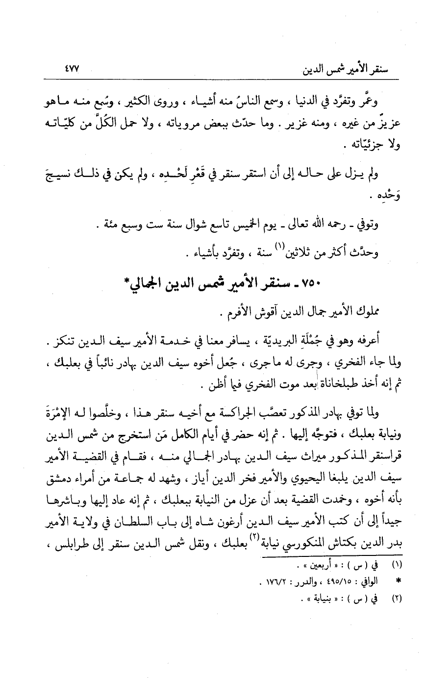 ولما توفي بهادر المذكور تعصب الجراكسة مع أخيه سنقر هذا، وخلصوا له الإمرة ونيابة بعلبك، فتوجه إليها. ثم إنه حضر في أيام الكامل من استخرج من شمس الدين قراسنقر المذكور ميراث سيف الدين بهادر الجمالي منه، فقام في القضية الأمير سيف الدين يلبغا اليحيوي والأمير فخر الدين أياز، وشهد له جماعة من أمراء دمشق بأنه أخوه، وخمدت القضية بعد أن عزل من النيابة ببعلبك، ثم إنه عاد إليها وباشرها جيداً إلى أن كتب الأمير سيف الدين أرغون شاه إلى باب السلطان في ولاية الأمير بدر الدين بكتاش المنكورسي نيابة بعلبك، ونقل شمس الدين سنقر إلى طرابلس،