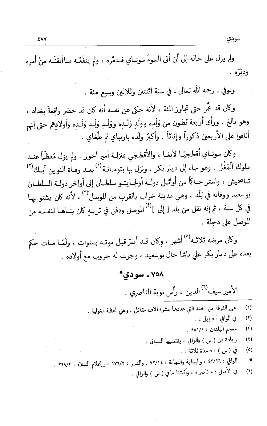 وكان سوتاي أقطجيا لأبغا، والأقطجي بمنزلة أمير آخور. ولم يزل معظماً عند ملوك المغل. وهو جاء إلى ديار بكر، ونزل بها بتومانة بعد وفاة النوين آبك تاصميش، واستمر حاكماً من أوائل دولة أولجايتو سلطان إلى أواخر دولة السلطان بوسعيد ووفاته في بلد، وهي مدينة خراب بالقرب من الموصل، لأنه كان يشتو بها في كل سنة، ثم إنه نقل من بلد إلى الموصل ودفن في تربة كان بناها لنفسه من الموصل على دجلة.