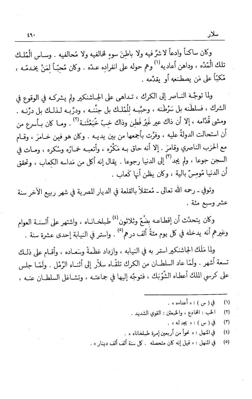 ولما توجه الناصر إلى الكرك، تداها على الجاشنكير ولم يشركه في الوقوع في الشرك، فسلطنه بل سرطنه، وحببه للملك بل جننه، ودربه لذلك بل درنه. ومشى قدامه، إلا أن ذاك عير غير فطن وذاك خب خبعثنة. وما كان بأسرع من أن استحالت الدولة عليه، وفرت بأجمعها من بين يديه. وكان هو فيمن خامر، وقام مع الحزب الناصري وقامر. إلا أنه حاق به مكره، وأتعبه خماره وسكره، ومات في السجن جوعا، ولم يجد إلى الدنيا رجوعا. يقال إنه أكل من مداسه الكعاب، وتحقق أن الدنيا مومس بالية، وكان يظن أنها كعاب.