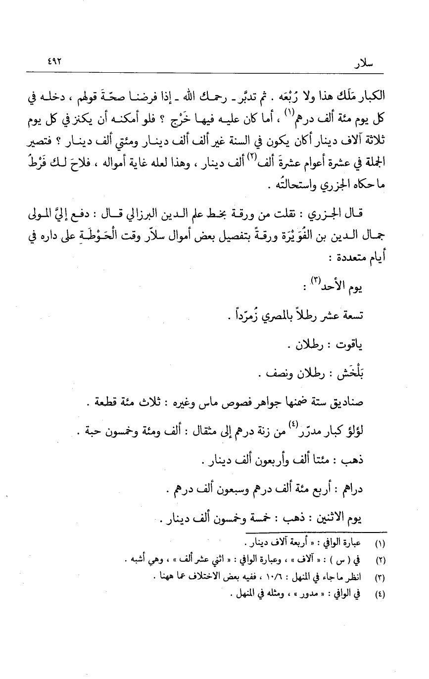 قال الجزري: نقلت من ورقة بخط علم الدين البرزالي قال: دفع إلي المولى جمال الدين بن الفويرة ورقةً بتفصيل بعض أموال سلار وقت الحوطة على داره في أيام متعددة: يوم الأحد: تسعة عشر رطلاً بالمصري زمرداً.