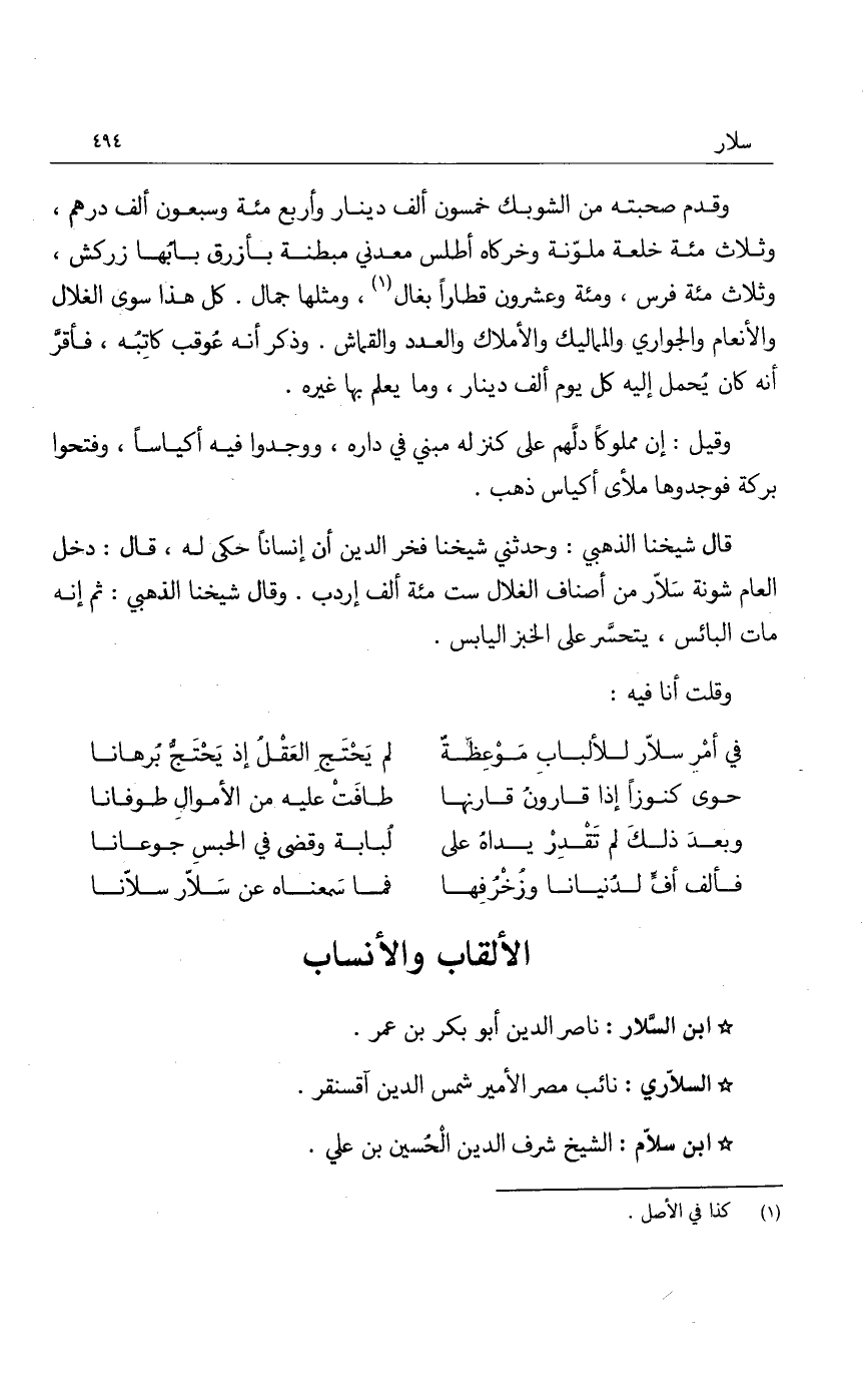 قال شيخنا الذهبي: وحدثني شيخنا فخر الدين أن إنساناً حكى له، قال: دخل العام شونة سلار من أصناف الغلال ست مئة ألف إردب. وقال شيخنا الذهبي: ثم إنه مات البائس، يتحسر على الخبز اليابس.
