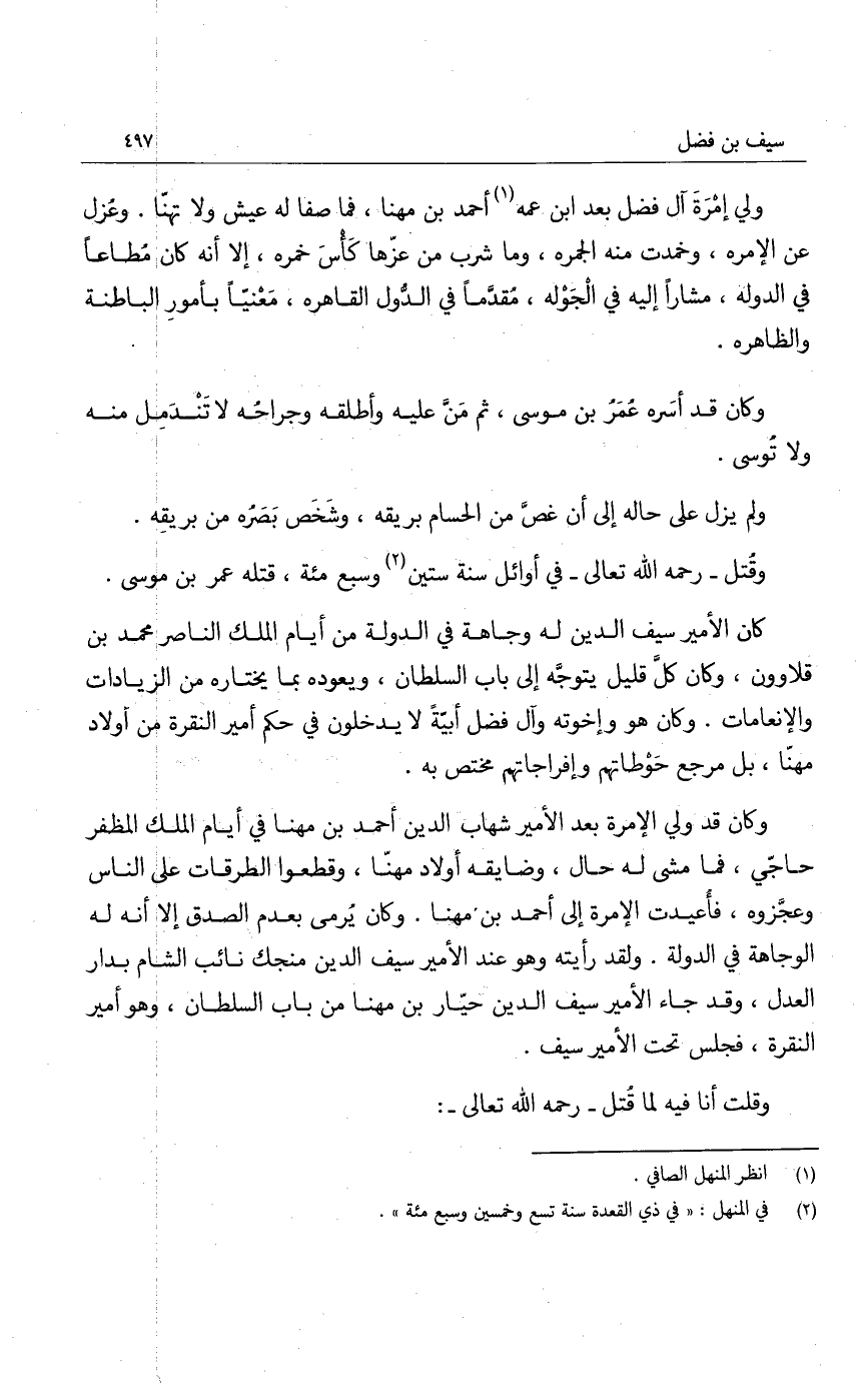ولي إمرة آل فضل بعد ابن عمه أحمد بن مهنا، فما صفا له عيش ولا تهنا. وعزل عن الإمره، وخمدت منه الجمره، وما شرب من عزها كأس خمره، إلا أنه كان مطاعاً في الدوله، مشاراً إليه في الجوله، مقدماً في الدول القاهره، معنياً بأمور الباطنة والظاهره.