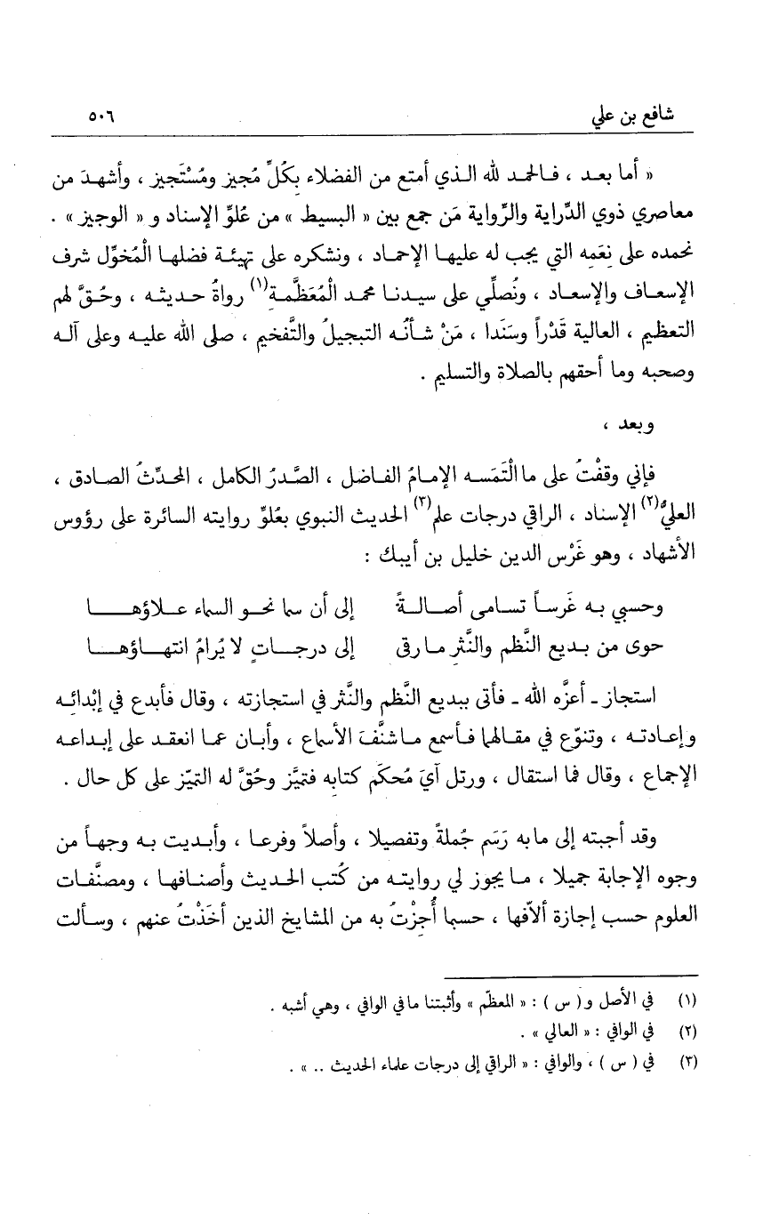 وبعد، فإني وقفت على ما التمسه الإمام الفاضل، الصدر الكامل، المحدث الصادق، العلي الإسناد، الراقي درجات علم الحديث النبوي بعلو روايته السائرة على رؤوس الأشهاد، وهو غرس الدين خليل بن أيبك: