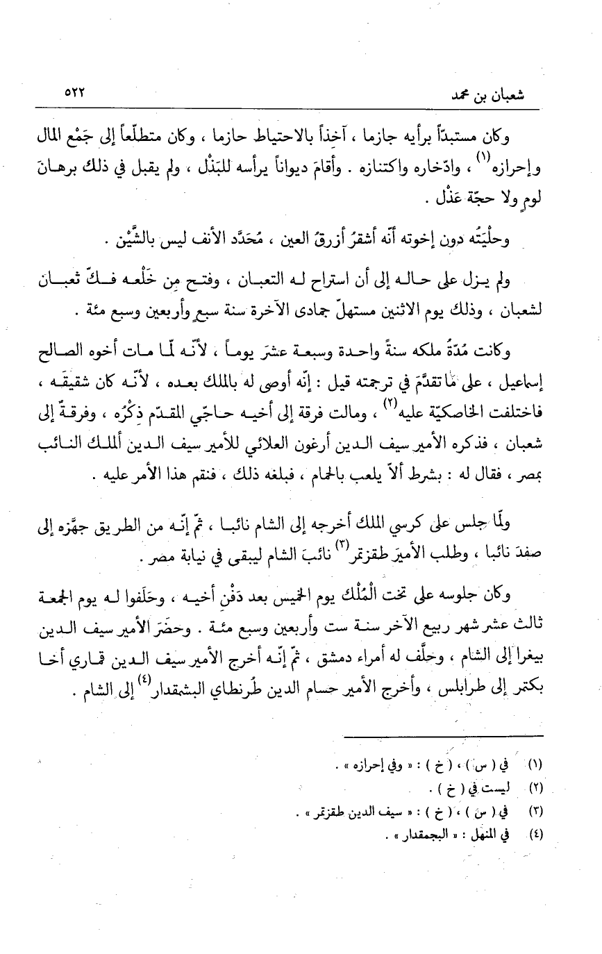 وكانت مدة ملكه سنةً واحدة وسبعة عشر يوماً، لأنه لما مات أخوه الصالح إسماعيل، على ما تقدم في ترجمته قيل: إنه أوصى له بالملك بعده، لأنه كان شقيقه، فاختلفت الخاصكية عليه، ومالت فرقة إلى أخيه حاجي المقدم ذكره، وفرقة إلى شعبان، فذكره الأمير سيف الدين أرغون العلائي للأمير سيف الدين ألملك النائب بمصر، فقال له: بشرط ألا يلعب بالحمام، فبلغه ذلك، فنقم هذا الأمر عليه.
