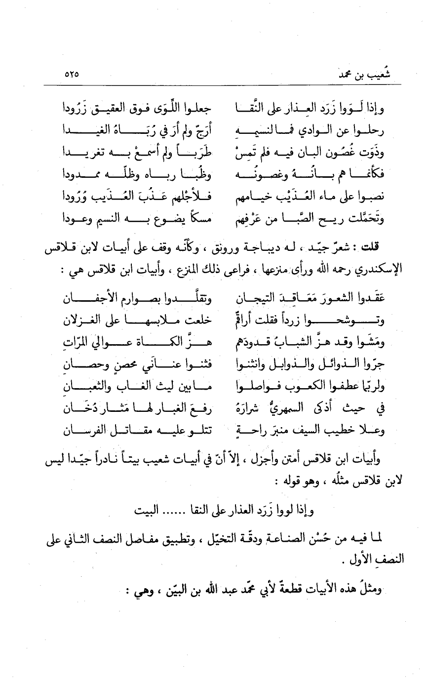 وأبيات ابن قلاقس أمتن وأجزل، إلا أن في أبيات شعيب بيتاً نادراً جيدا ليس لابن قلاقس مثله، وهو قوله: