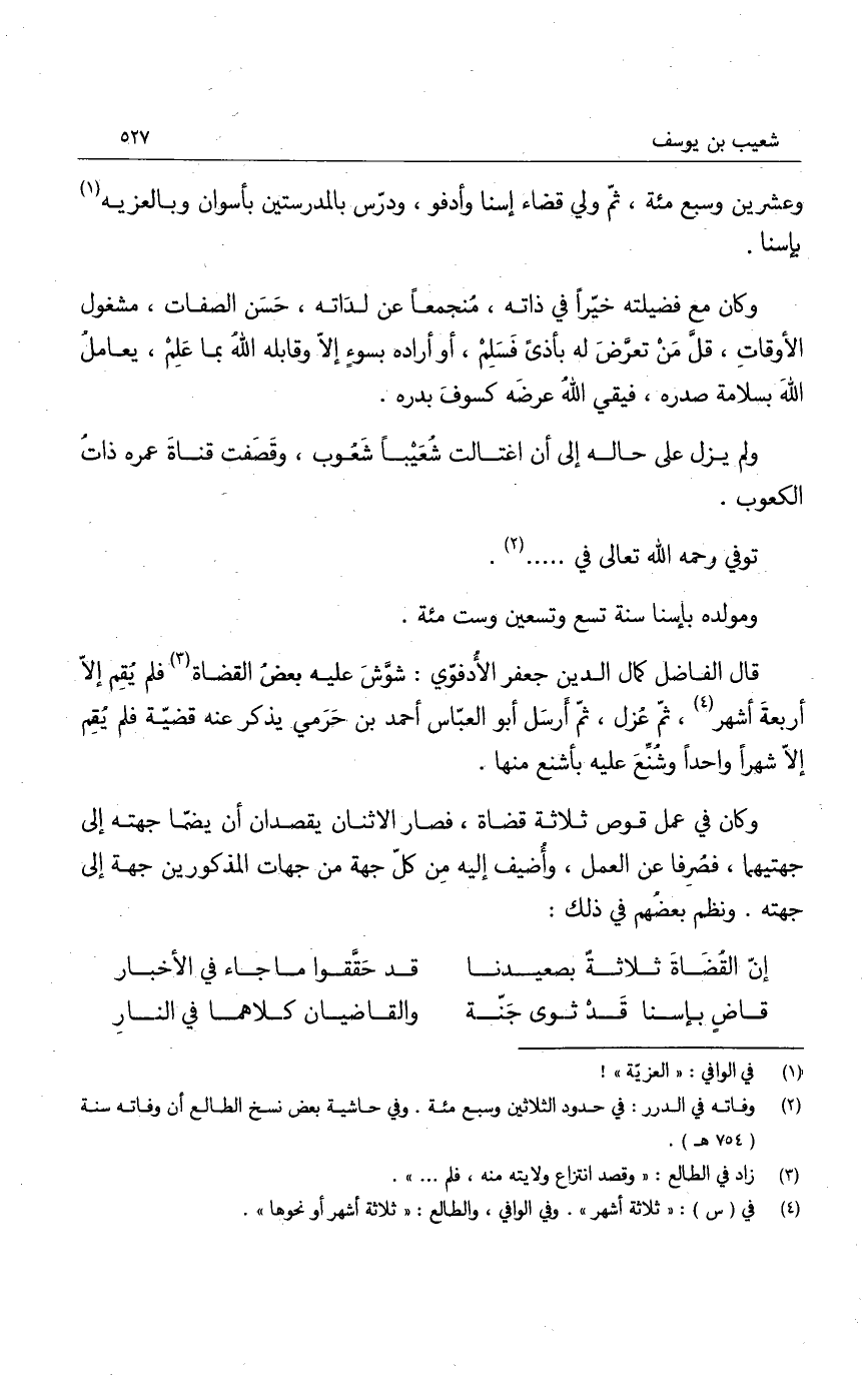 وعشرين وسبع مئة، ثم ولي قضاء إسنا وأدفو، ودرس بالمدرستين بأسوان وبالعزيه بإسنا.