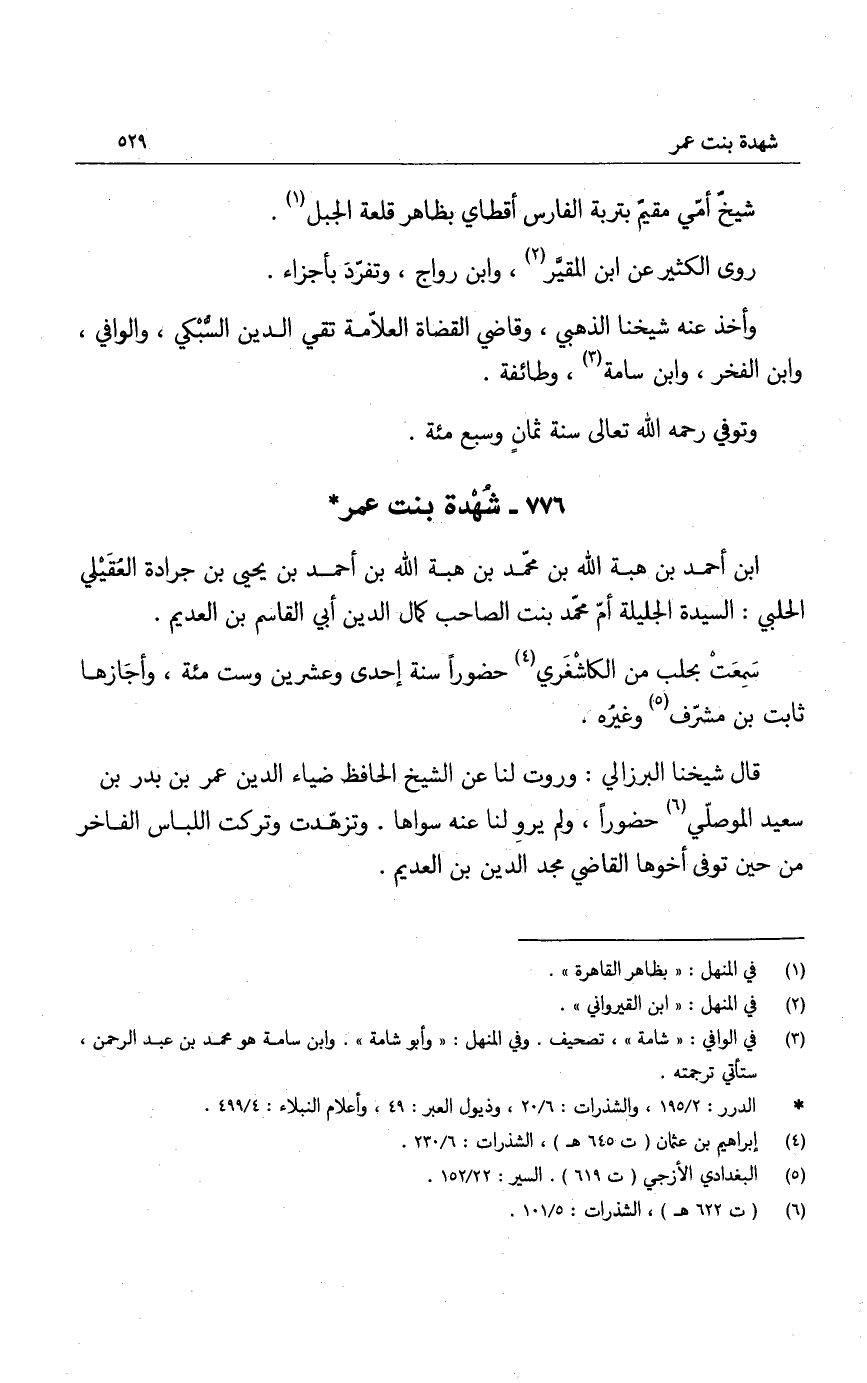 ابن أحمد بن هبة الله بن محمد بن هبة الله بن أحمد بن يحيى بن جرادة العقيلي الحلبي: السيدة الجليلة أم محمد بنت الصاحب كمال الدين أبي القاسم بن العديم.