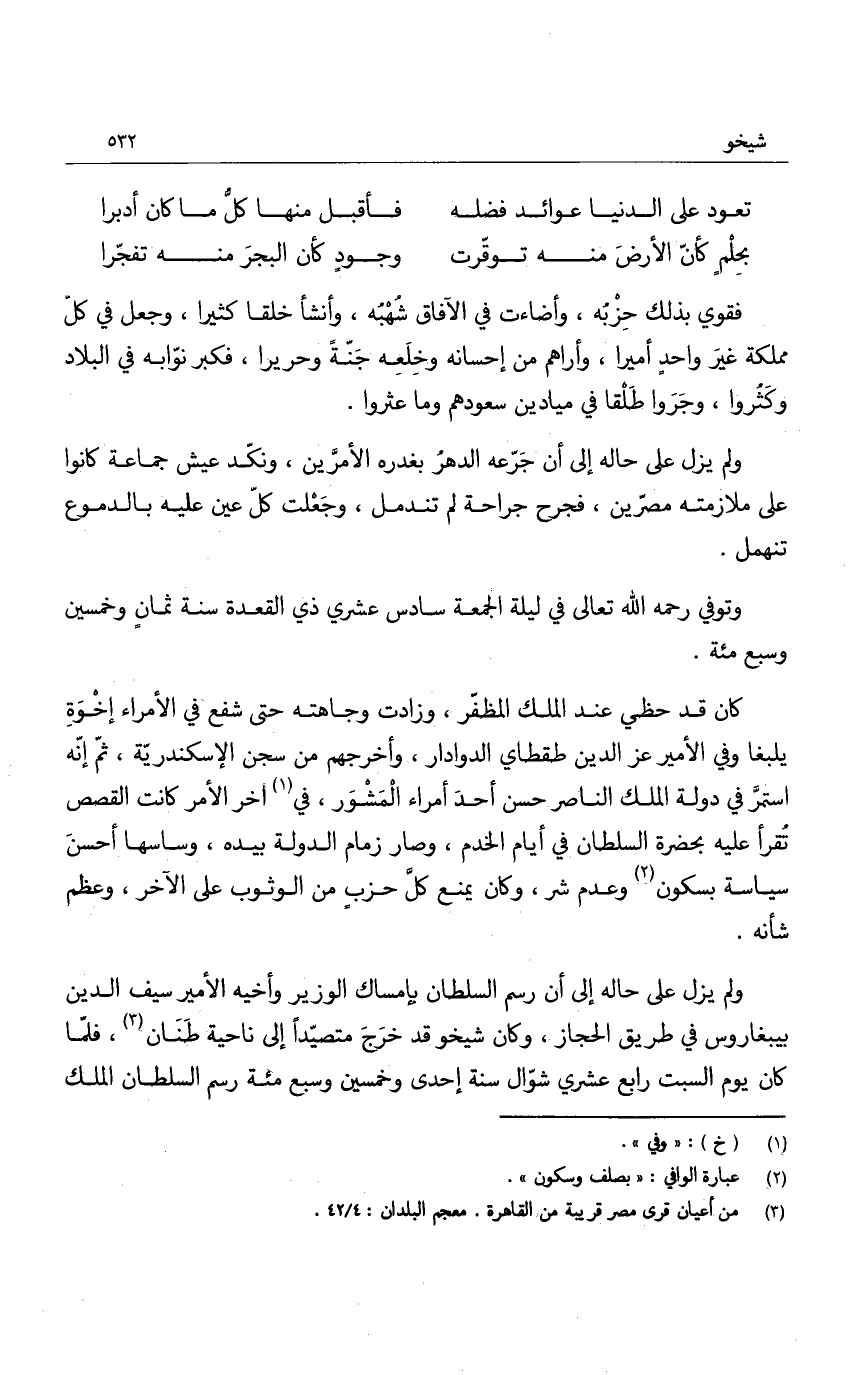 ولم يزل على حاله إلى أن رسم السلطان بإمساك الوزير وأخيه الأمير سيف الدين بيبغاروس في طريق الحجاز، وكان شيخو قد خرج متصيداً إلى ناحية طنان، فلما كان يوم السبت رابع عشري شوال سنة إحدى وخمسين وسبع مئة رسم السلطان الملك