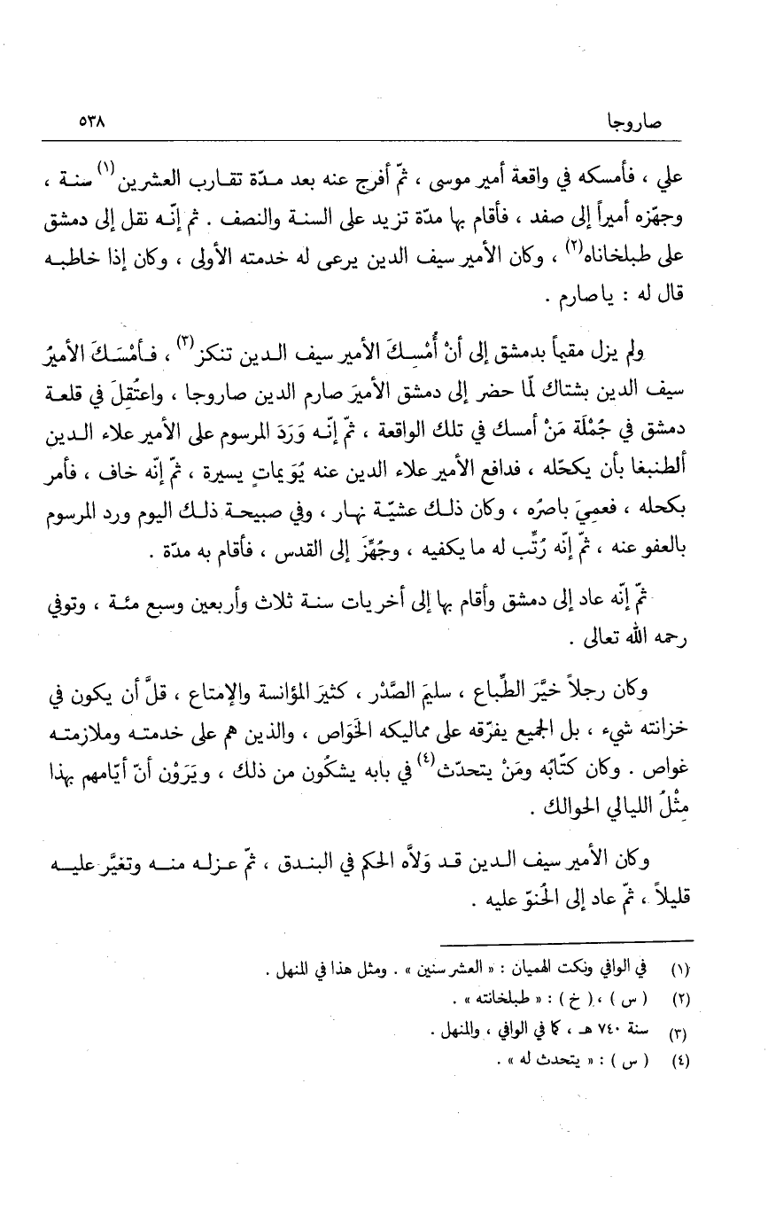 علي، فأمسكه في واقعة أمير موسى، ثم أفرج عنه بعد مدة تقارب العشرين سنة، وجهزه أميراً إلى صفد، فأقام بها مدة تزيد على السنة والنصف. ثم إنه نقل إلى دمشق على طبلخاناه، وكان الأمير سيف الدين يرعى له خدمته الأولى، وكان إذا خاطبه قال له: يا صارم.