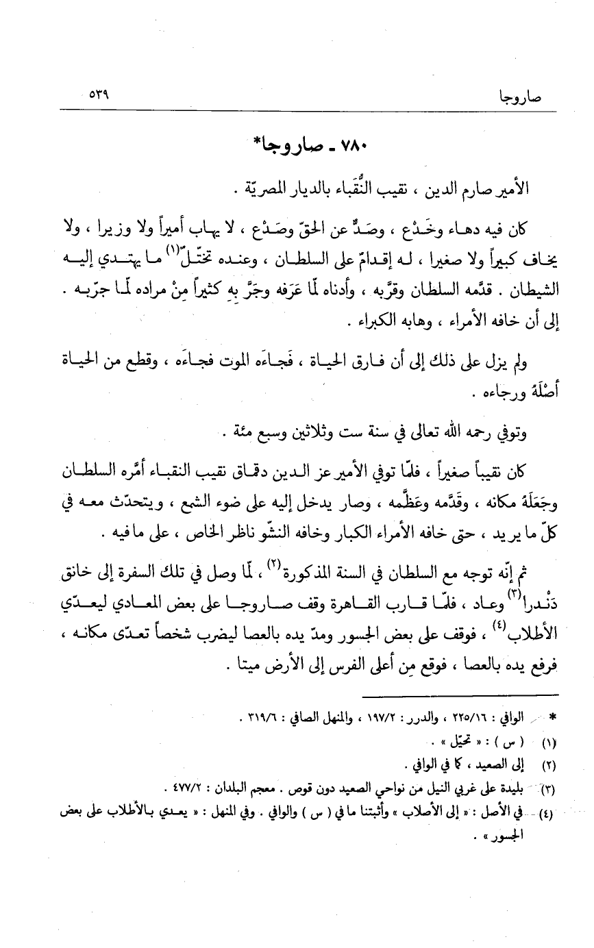 ثم إنه توجه مع السلطان في السنة المذكورة، لما وصل في تلك السفرة إلى خانق دندرا وعاد، فلما قارب القاهرة وقف صاروجا على بعض المعادي ليعدي الأطلاب، فوقف على بعض الجسور ومد يده بالعصا ليضرب شخصاً تعدى مكانه، فرفع يده بالعصا، فوقع من أعلى الفرس إلى الأرض ميتا.