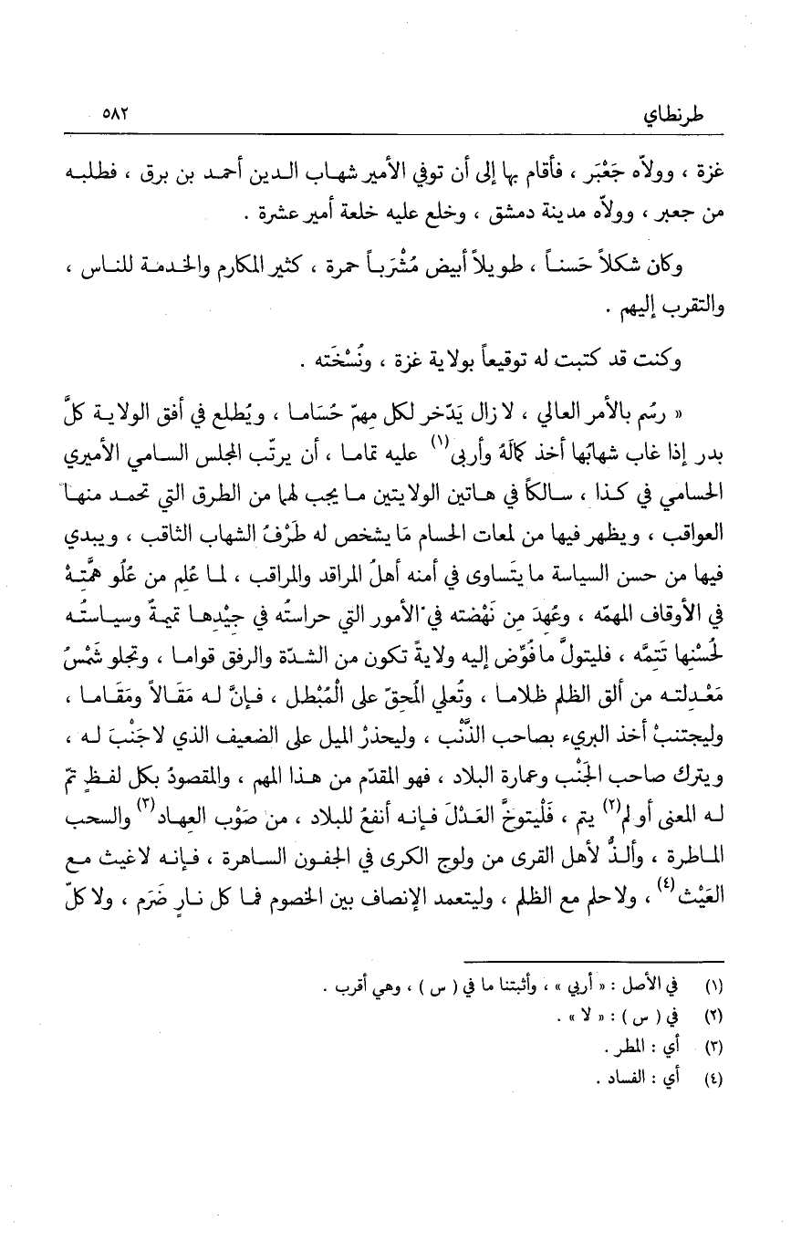 رسم بالأمر العالي، لا زال يدخر لكل مهم حساما، ويطلع في أفق الولاية كل بدر إذا غاب شهابها أخذ كماله وأربى عليه تماما، أن يرتب المجلس السامي الأميري الحسامي في كذا، سالكاً في هاتين الولايتين ما يجب لهما من الطرق التي تحمد منها العواقب، ويظهر فيها من لمعات الحسام ما يشخص له طرف الشهاب الثاقب، ويبدي فيها من حسن السياسة ما يتساوى في أمنه أهل المراقد والمراقب، لما علم من علو همته في الأوقاف المهمه، وعهد من نهضته في الأمور التي حراسته في جيدها تميمة وسياسته لحسنها تتمه، فليتول ما فوض إليه ولايةً تكون من الشدة والرفق قواما، وتجلو شمس معدلته من ألق الظلم ظلاما، وتعلي المحق على المبطل، فإن له مقالاً ومقاما، وليجتنب أخذ البريء بصاحب الذنب، وليحذر الميل على الضعيف الذي لا جنب له، ويترك صاحب الجنب وعمارة البلاد، فهو المقدم من هذا المهم، والمقصود بكل لفظ تم له المعنى أو لم يتم، فليتوخ العدل فإنه أنفع للبلاد، من صوب العهاد والسحب الماطرة، وألذ لأهل القرى من ولوج الكرى في الجفون الساهرة، فإنه لا غيث مع العيث، ولا حلم مع الظلم، وليتعمد الإنصاف بين الخصوم فما كل نار ضرم، ولا كل