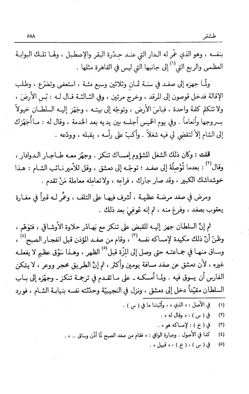 قلت: وكان ذلك الشغل المشؤوم إمساك تنكز. وجهز معه طاجار الدوادار، وقال: بعدما توصله إلى صفد؛ توجه إلى دمشق، وقل للأمير نائب الشام: هذا خوشداشك الكبير، وقد صار جارك، فراعه، ولا تعامله معاملة من تقدم.