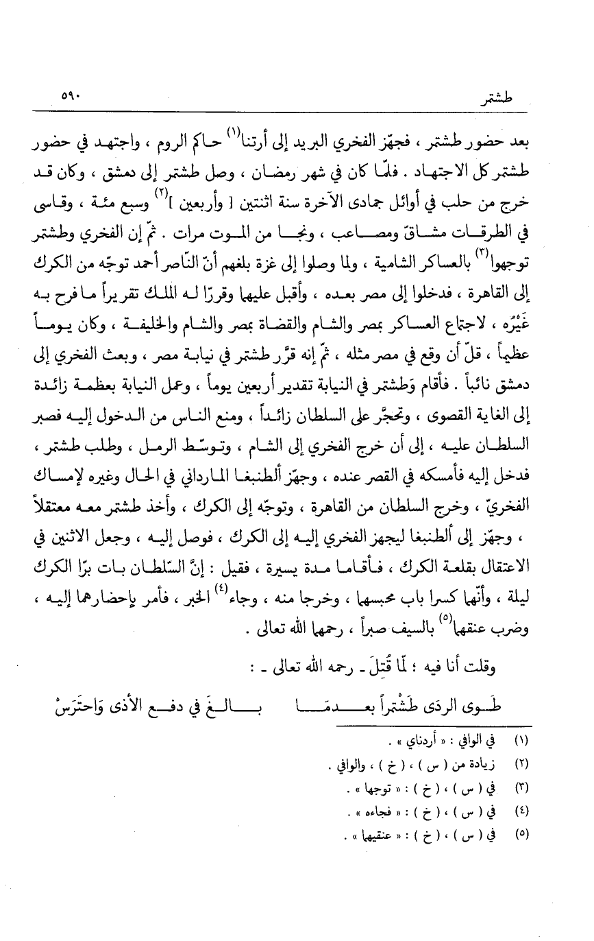بعد حضور طشتمر، فجهز الفخري البريد إلى أرتنا حاكم الروم، واجتهد في حضور طشتمر كل الاجتهاد. فلما كان في شهر رمضان، وصل طشتمر إلى دمشق، وكان قد خرج من حلب في أوائل جمادى الآخرة سنة اثنتين وأربعين وسبع مئة، وقاسى في الطرقات مشاق ومصاعب، ونجا من الموت مرات. ثم إن الفخري وطشتمر توجهوا بالعساكر الشامية، ولما وصلوا إلى غزة بلغهم أن الناصر أحمد توجه من الكرك إلى القاهرة، فدخلوا إلى مصر بعده، وأقبل عليهما وقررا له الملك تقريراً ما فرح به غيره، لاجتماع العساكر بمصر والشام والقضاة بمصر والشام والخليفة، وكان يوماً عظيماً، قل أن وقع في مصر مثله، ثم إنه قرر طشتمر في نيابة مصر، وبعث الفخري إلى دمشق نائباً. فأقام وطشتمر في النيابة تقدير أربعين يوماً، وعمل النيابة بعظمة زائدة إلى الغاية القصوى، وتحجر على السلطان زائداً، ومنع الناس من الدخول إليه فصبر السلطان عليه، إلى أن خرج الفخري إلى الشام، وتوسط الرمل، وطلب طشتمر، فدخل إليه فأمسكه في القصر عنده، وجهز ألطنبغا المارداني في الحال وغيره لإمساك الفخري، وخرج السلطان من القاهرة، وتوجه إلى الكرك، وأخذ طشتمر معه معتقلاً، وجهز إلى ألطنبغا ليجهز الفخري إليه إلى الكرك، فوصل إليه، وجعل الاثنين في الاعتقال بقلعة الكرك، فأقاما مدة يسيرة، فقيل: إن السلطان بات برا الكرك ليلة، وأنهما كسرا باب محبسهما، وخرجا منه، وجاء الخبر، فأمر بإحضارهما إليه، وضرب عنقهما بالسيف صبراً، رحمهما الله تعالى.