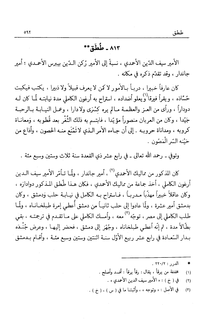كان المذكور من مماليك الأحمدي، أمير جاندار، ولما تأمر الأمير سيف الدين أرغون الكاملي، أخذ جماعة من مماليك الأحمدي، فكان هذا ططق المذكور دواداره، وكان عاقلاً خبيراً مهذباً مدرباً، فاستراح به الكامل في نيابة حلب ودمشق، وكان بدمشق أمير عشرة، ولما عادوا إلى حلب ثانياً من دمشق أعطي إمرة طبلخاناه، ولما طلب الكاملي إلى مصر، توجه معه، وأمسك الكاملي على ما تقدم في ترجمته، بقي بطالاً مدة، ثم إنه أعطي طبلخاناه، وجهز إلى دمشق، فحضر إليها، وعرض جنده بدار السعادة في رابع عشر ربيع الأول سنة اثنتين وستين وسبع مئة، وأقام بدمشق