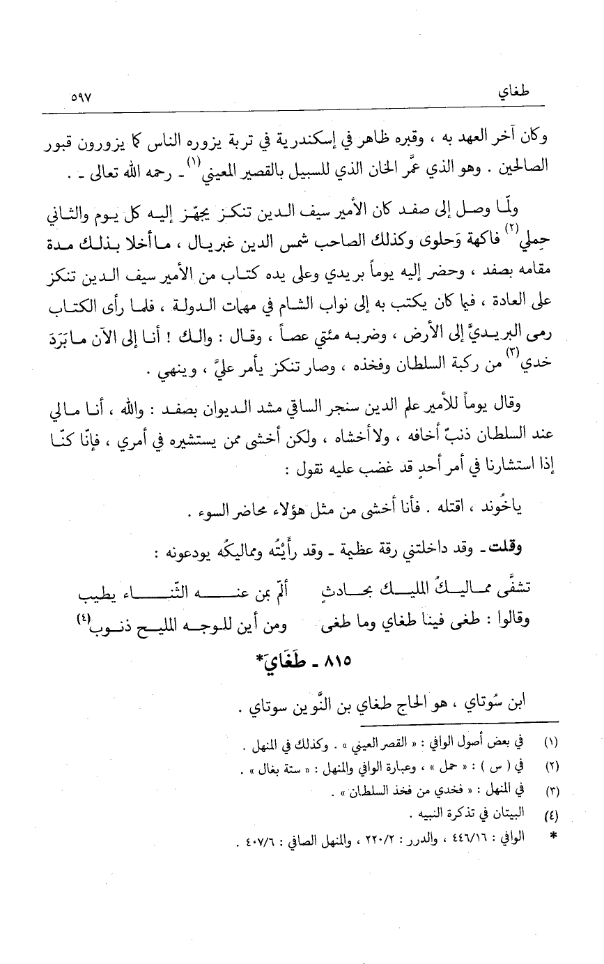 ولما وصل إلى صفد كان الأمير سيف الدين تنكز يجهز إليه كل يوم والثاني حملي فاكهة وحلوى وكذلك الصاحب شمس الدين غبريال، ما أخلا بذلك مدة مقامه بصفد، وحضر إليه يوماً بريدي وعلى يده كتاب من الأمير سيف الدين تنكز على العادة، فيما كان يكتب به إلى نواب الشام في مهمات الدولة، فلما رأى الكتاب رمى البريدي إلى الأرض، وضربه مئتي عصاً، وقال: والك! أنا إلى الآن ما برد خدي من ركبة السلطان وفخذه، وصار تنكز يأمر علي، وينهي.