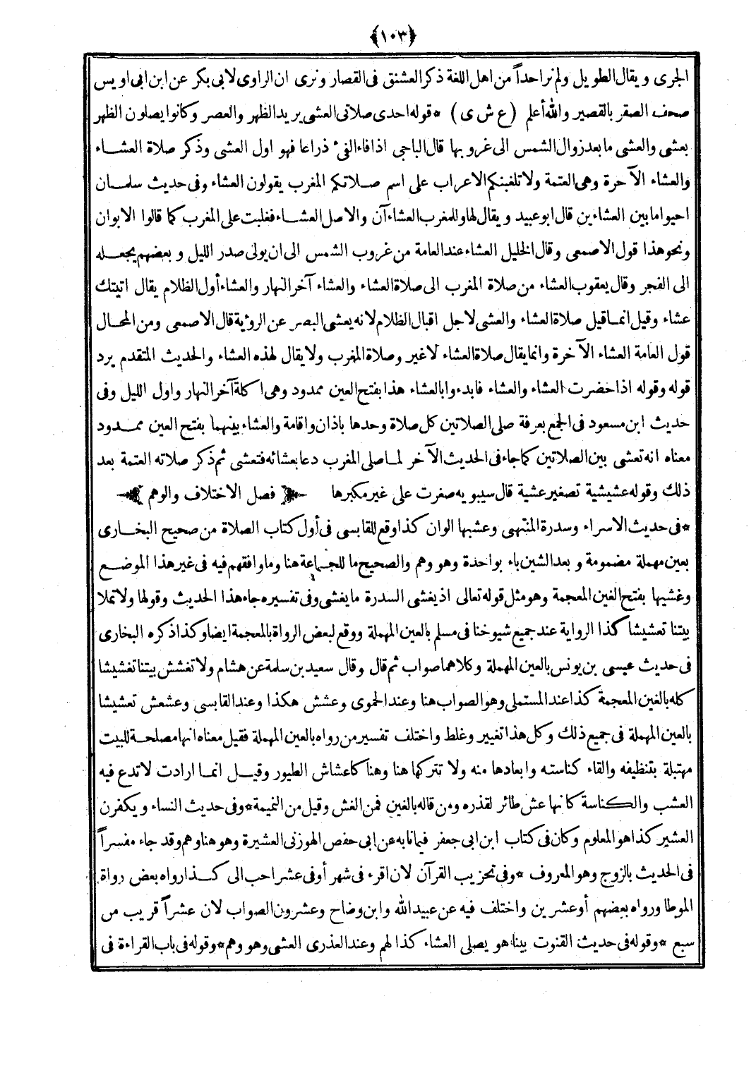 (ع ش ي) قَوْله إِحْدَى صَلَاتي الْعشي يُرِيد الظّهْر وَالْعصر وَكَانُوا يصلونَ الظّهْر بعشي والعشي مَا بعد زَوَال الشَّمْس إِلَى غُرُوبهَا قَالَ الْبَاجِيّ إِذا فَاء الفئ ذِرَاعا فَهُوَ أول العشى وَذكر صَلَاة الْعشَاء وَالْعشَاء الْآخِرَة وَهِي الْعَتَمَة وَلَا تغلبنكم الْأَعْرَاب على اسْم صَلَاتكُمْ الْمغرب يَقُولُونَ الْعشَاء وَفِي حَدِيث سلمَان أحيوا مَا بَين العشائين قَالَ أَبُو عبيد وَيُقَال لَهَا وللمغرب الْعشَاء آن وَالْأَصْل الْعشَاء فَغلبَتْ على الْمغرب كَمَا قَالُوا الأبوان وَنَحْو هَذَا قَول الْأَصْمَعِي وَقَالَ الْخَلِيل الْعشَاء عِنْد الْعَامَّة من غرُوب الشَّمْس إِلَى أَن يولي صدر اللَّيْل وَبَعْضهمْ يَجعله إِلَى الْفجْر وَقَالَ يَعْقُوب الْعشَاء من صَلَاة الْمغرب إِلَى صَلَاة الْعشَاء وَالْعشَاء آخر النَّهَار وَالْعشَاء أول الظلام يُقَال أَتَيْتُك عشَاء وَقيل إِنَّمَا قيل صَلَاة الْعشَاء والعشي لأجل إقبال الظلام لِأَنَّهُ يعشي الْبَصَر عَن الرُّؤْيَة قَالَ الْأَصْمَعِي وَمن الْمحَال قَول الْعَامَّة الْعشَاء الْآخِرَة وَإِنَّمَا يُقَال صَلَاة الْعشَاء لَا غير وَصَلَاة الْمغرب وَلَا يُقَال لهَذِهِ الْعشَاء والْحَدِيث الْمُتَقَدّم يرد قَوْله وَقَوله إِذا حضرت الْعشَاء وَالْعشَاء فابدءوا بالعشاء هَذَا بِفَتْح الْعين مَمْدُود وَهِي آكِلَة آخر النَّهَار وَأول اللَّيْل وَفِي حَدِيث ابْن مَسْعُود فِي الْجمع بِعَرَفَة صلى الصَّلَاتَيْنِ كل صَلَاة وَحدهَا بِأَذَان وَإِقَامَة وَالْعشَاء بَينهمَا بِفَتْح الْعين مَمْدُود مَعْنَاهُ أَنه تعشى بَين الصَّلَاتَيْنِ كَمَا جَاءَ فِي الحَدِيث الآخر لما صلى الْمغرب دَعَا بعشائه فتعشى ثمَّ ذكر صلَاته الْعَتَمَة بعد ذَلِك وَقَوله عشيشة تَصْغِير عَشِيَّة قَالَ سِيبَوَيْهٍ صغرت على غير مكبرها.