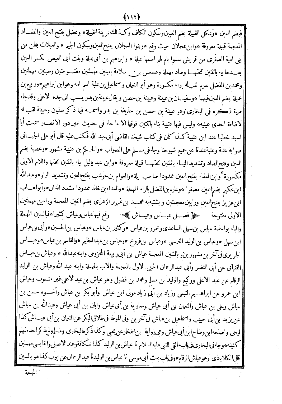 فبضم الْعين وعكل الْقَبِيلَة بِضَم الْعَينَيْنِ وَسُكُون الْكَاف وَكَذَلِكَ عرينة الْقَبِيلَة وعضل بِفَتْح الْعين وَالضَّاد الْمُعْجَمَة قَبيلَة مَعْرُوفَة وَابْن عجلَان حَيْثُ وَقع وبنوا العجلان بِفَتْح الْعين وَسُكُون الْجِيم والعبلات بطن من بني أُميَّة الصُّغْرَى من قُرَيْش سموا بِأم لَهُم اسْمهَا عبلة وَإِبْرَاهِيم بن أبي عبلة وَبنت أبي الْعيص بِكَسْر الْعين بعْدهَا يَاء بِاثْنَتَيْنِ تحتهَا وصاد مُهْملَة وعسعس بن سَلامَة بعينين مهملتين مفتوحتين وسينين مهملتين وَمُحَمّد بن الْفضل عَارِم لقب لَهُ برَاء مَكْسُورَة وَهُوَ أَبُو النُّعْمَان وَإِسْمَاعِيل بن علية اسْم أمه وَهُوَ ابْن إِبْرَاهِيم وربيع بن عميلة بِضَم الْعين فيهمَا وسُفْيَان بن عُيَيْنَة وعيينة بن حصن وَيُقَال عُيَيْنَة بن بدر ينْسب إِلَى جده الْأَعْلَى وَقد جَاءَ مرّة ذكره فِي البُخَارِيّ وَهُوَ عُيَيْنَة بن حصن بن حُذَيْفَة بن بدر واسْمه فِيمَا ذكر سُفْيَان وعيينة لقب لَهُ لإضاءة إِحْدَى عَيْنِيَّة