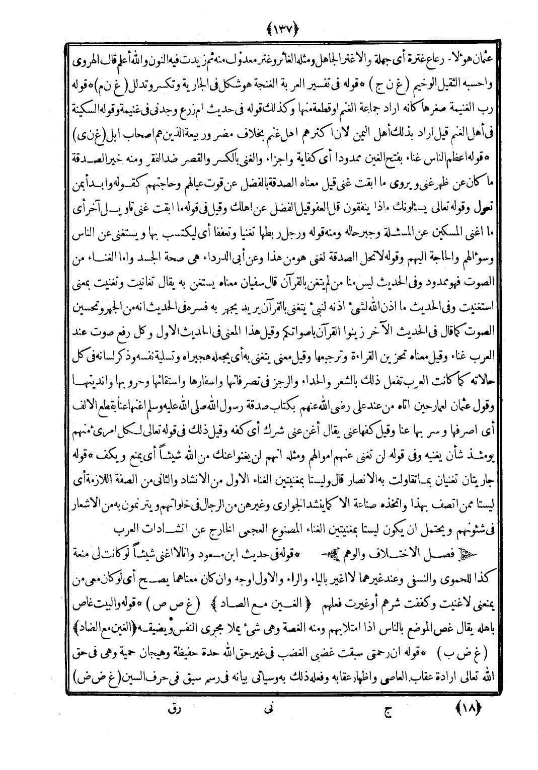 (قيل الْفضل عَن أهلك وَقيل فِي قَوْله مَا أبقت غَنِي تَأْوِيل آخر أَي مَا أغْنى الْمِسْكِين عَن الْمَسْأَلَة وجبر حَاله وَمِنْه قَوْله وَرجل ربطها تغَنِّيا وَتَعَفُّفًا أَي ليكتسب بهَا ويستغنى عَن النَّاس وسؤالهم وَالْحَاجة إِلَيْهِم وَقَوله لَا تحل الصَّدَقَة لَغَنِيّ هُوَ من هَذَا وَعَن أبي الدَّرْدَاء هِيَ صِحَة الْجَسَد وَأما الْغناء من الصَّوْت فَهُوَ مَمْدُود وَفِي الحَدِيث لَيْسَ منا من لم يَتَغَنَّ بِالْقُرْآنِ قَالَ سُفْيَان مَعْنَاهُ يسْتَغْن بِهِ يُقَال تغانيت وتغنيت بِمَعْنى اسْتَغْنَيْت وَفِي الحَدِيث مَا أذن الله لشَيْء إِذْنه لبني يتَغَنَّى بِالْقُرْآنِ يُرِيد يجْهر بِهِ فسره فِي الحَدِيث أَنه من الْجَهْر وتحسين الصَّوْت كَمَا قَالَ فِي الحَدِيث الآخر زَينُوا الْقُرْآن بِأَصْوَاتِكُمْ وَقيل هَذَا الْمَعْنى فِي الحَدِيث الأول وكل رفع صَوت عِنْد الْعَرَب غناء وَقيل مَعْنَاهُ تحزين الْقِرَاءَة وترجيعها وَقيل معنى يتَغَنَّى بِهِ أَي يَجعله هجيراه وتسلية نَفسه وَذكر لِسَانه فِي كل حالاته كَمَا كَانَت الْعَرَب تفعل ذَلِك بالشعر والحداء وَالرجز فِي تصرفاتها وأسفارها واستقائها وحروبها وأنديتها وَقَول عُثْمَان لعمَّار حِين أَتَاهُ من عِنْد عَليّ رَضِي الله عَنْهُم بِكِتَاب صَدَقَة رَسُول الله (صلى الله عَلَيْهِ وَسلم) أغنها عَنَّا بِقطع الْألف أَي أصرفها وسر بهَا عَنَّا وَقيل كفها عني يُقَال أغن عني شرك أَي كَفه وَقيل ذَلِك فِي قَوْله تَعَالَى) لكل امْرِئ مِنْهُم يَوْمئِذٍ شَأْن يُغْنِيه