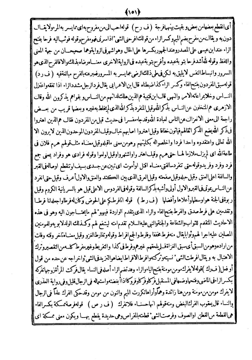 (ف رد) قَوْله سبق المفردون بِفَتْح الْفَاء وَكسر الرَّاء كَذَا ضبطناه قَالَ ابْن الْأَعرَابِي يُقَال فَرد الرجل مشدد الرَّاء إِذا تفقه وَاعْتَزل النَّاس وخلا بمراعاته الْأَمر وَالنَّهْي قَالَ ابْن قُتَيْبَة هم الَّذين هلك لداتهم من النَّاس وبقواهم يذكرُونَ الله وَقَالَ الْأَزْهَرِي هم المتخلون عَن النَّاس بِذكر الله وَقيل الْمُنْفَرد بِذكر الله الَّذِي لم يخلط بِهِ غَيره وَبَعضهَا قريب من بعض رَاجِعَة إِلَى معنى الانعزال عَن النَّاس لعبادة الله وَقد جَاءَ مُفَسرًا فِي حَدِيث قيل من المفردون فَقَالَ هم الَّذين اهتروا فِي ذكر الله يضع الذّكر أثقالهم قيأتون خفافا وَقيل اهتروا أَصَابَهُم خبال وَقيل المفردون الموحدون الَّذين لَا يرَوْنَ إِلَّا الله تَعَالَى واعتقدوه وَاحِدًا فَردا وَأَخْلصُوا لَهُ بكليتهم وَهُوَ من معنى مَا قبله وَقيل مَعْنَاهُ مثل قَوْلهم هرم فلَان فِي طَاعَة الله أَي لم يزل ملازما لَهَا حَتَّى هرم وَقيل اهتروا واشتهروا وَقيل أولعوا وَقَوله فُرَادَى هُوَ وفراد بِمَعْنى جمع فَرد وفرد وفريد وَقَوله حَتَّى تنفرد سالفتي مَعْنَاهُ اقْتُل أَو أَمُوت أَي تبين عَن جَسَدِي بِسيف أَو تَنْقَطِع أوصاله فِي الْقَبْر والسالفة أَعلَى الْعُنُق وَقيل حبله وَقيل صفحته وَقيل الْعرق الَّذِي بَين الكتد والعنق وَالْأول أعرف وَقيل حَتَّى انْفَرد عَن النَّاس بموتي فِي الْقَبْر وَالْأول أولى وأشبه بِذكر السالفة وَقَوله فِي الفردوس الْأَعْلَى قيل هُوَ بالسُّرْيَانيَّة الكروم وَقيل ربوة فِي الْجنَّة هُوَ أوسطها وأعلاها وأفضلها