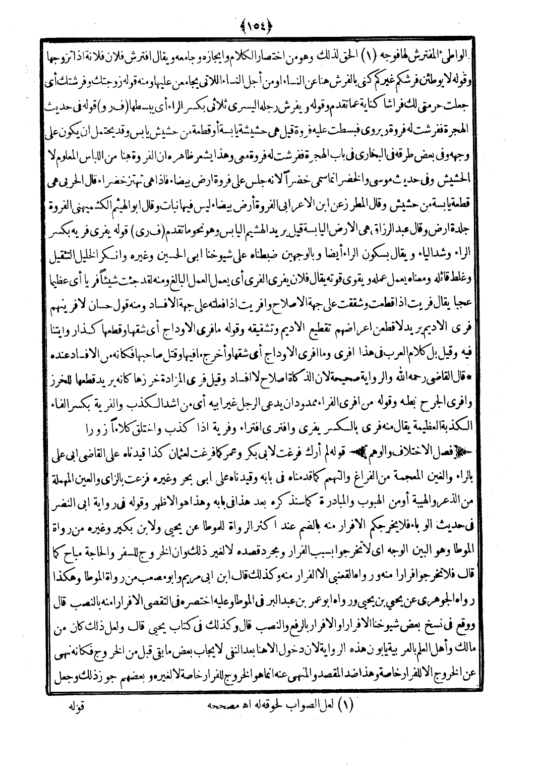 قَوْله لم أرك فرغت لأبي بكر وَعمر كَمَا فرغت لعُثْمَان كَذَا قيدناه على القَاضِي أبي عَليّ بالراء والغين الْمُعْجَمَة من الْفَرَاغ والتهمم كَمَا قدمْنَاهُ فِي بَابه وقيدناه على أبي بَحر وَغَيره فزعت بالزاي وَالْعين الْمُهْملَة من الذعر والهيبة أَو من الهبوب والمبادرة كَمَا سَنذكرُهُ بعد هَذَا فِي بَابه وَهَذَا هُوَ الْأَظْهر وَقَوله فِي رِوَايَة أبي النَّضر فِي حَدِيث الوباء فَلَا يخرجكم الإفرار مِنْهُ بِالضَّمِّ عِنْد أَكثر الروَاة للموطأ عَن يحيى وَلابْن بكير وَغَيره من رُوَاة الْمُوَطَّأ وَهُوَ الْبَين الْوَجْه أَي لَا تخْرجُوا بِسَبَب الْفِرَار وَمُجَرَّد قَصده لَا لغير ذَلِك وَإِن الْخُرُوج للسَّفر وَالْحَاجة مُبَاح كَمَا قَالَ فَلَا تخْرجُوا فِرَارًا مِنْهُ وَرَوَاهُ القعْنبِي إِلَّا الْفِرَار مِنْهُ وَكَذَلِكَ قَالَ ابْن أبي مَرْيَم وَأَبُو مُصعب من رُوَاة الْمُوَطَّأ وَهَكَذَا رَوَاهُ الْجَوْهَرِي عَن يحيى بن يحيى وَرَوَاهُ أَبُو عمر بن عبد الْبر فِي الْمُوَطَّأ وَعَلِيهِ اخْتَصَرَهُ فِي التَّقَصِّي إِلَّا فِرَارًا مِنْهُ بِالنّصب قَالَ وَوَقع فِي نسخ بعض شُيُوخنَا إِلَّا فِرَارًا وَإِلَّا فرار بِالرَّفْع وَالنّصب قَالَ وَكَذَلِكَ فِي كتاب يحيى قَالَ وَلَعَلَّ ذَلِك كَانَ من مَالك وَأهل الْعلم بِالْعَرَبِيَّةِ يأبون هَذِه الرِّوَايَة لِأَن دُخُول إِلَّا هُنَا بعد النَّفْي لإِيجَاب بعض مَا بَقِي قبل من الْخُرُوج فَكَأَنَّهُ نهى عَن الْخُرُوج إِلَّا للفرار خَاصَّة وَهَذَا ضد الْمَقْصد والمنهي عَنهُ إِنَّمَا هُوَ الْخُرُوج للفرار خَاصَّة لَا لغيره وَبَعْضهمْ جوز ذَلِك وَجعل