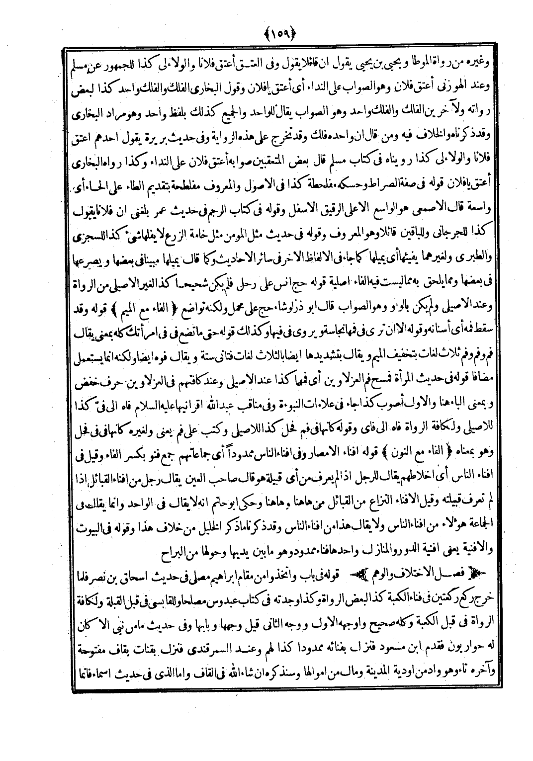 وَغَيره من رُوَاة الْمُوَطَّأ وَيحيى بن يحيى يَقُول أَن قَائِلا يَقُول وَفِي الْعتْق أعتق فلَانا وَالْوَلَاء لي كَذَا لِلْجُمْهُورِ عَن مُسلم وَعند الْهَوْزَنِي أعتق فلَان وَهُوَ الصَّوَاب على النداء أَي أعتق يَا فلَان وَقَول البُخَارِيّ الْفلك والفلك وَاحِد كَذَا لبَعض رُوَاته ولآخرين الْفلك والفلك وَاحِد وَهُوَ الصَّوَاب يُقَال للْوَاحِد والجميع كَذَلِك بِلَفْظ وَاحِد وَهُوَ مُرَاد البُخَارِيّ وَقد ذَكرْنَاهُ وَالْخلاف فِيهِ وَمن قَالَ أَن واحده فلك وَقد تخرج على هَذِه الرِّوَايَة وَفِي حَدِيث بَرِيرَة يَقُول أحدهم أعتق فلَانا وَالْوَلَاء لي كَذَا روينَاهُ فِي كتاب مُسلم قَالَ بعض المتعقبين صَوَابه أعتق فلَان على النداء وَكَذَا رَوَاهُ البُخَارِيّ أعتق يَا فلَان قَوْله فِي صفة الصِّرَاط وحسكه مفلحطة كَذَا فِي الْأُصُول وَالْمَعْرُوف مفلطحة بِتَقْدِيم الطَّاء على الْحَاء أَي وَاسِعَة قَالَ الْأَصْمَعِي هُوَ الْوَاسِع الْأَعْلَى الرَّقِيق الْأَسْفَل وَقَوله فِي كتاب الرَّجْم فِي حَدِيث عمر بَلغنِي أَن فلَانا يَقُول كَذَا للجرجاني وللباقين قَائِلا وَهُوَ الْمَعْرُوف وَقَوله فِي حَدِيث مثل الْمُؤمن مثل خامة الزَّرْع لَا يفلها شَيْء كَذَا للسجزي والطبري ولغيرهما يفيئها أَي يميلها كَمَا جَاءَ فِي الْأَلْفَاظ الآخر فِي سَائِر الْأَحَادِيث وكما قَالَ يميلها مُبينًا فِي بَعْضهَا ويصرعها فِي بَعْضهَا وَمِمَّا يلْحق بِهِ مِمَّا لَيست فِيهِ الْفَاء أَصْلِيَّة قَوْله حج أنس على رَحل فَلم يكن شحيحا كَذَا لغير الْأصيلِيّ من الروَاة وَعند الْأصيلِيّ وَلم يكن بِالْوَاو وَهُوَ الصَّوَاب قَالَ أَبُو ذَر لَو شَاءَ حج على محمل وَلكنه تواضع