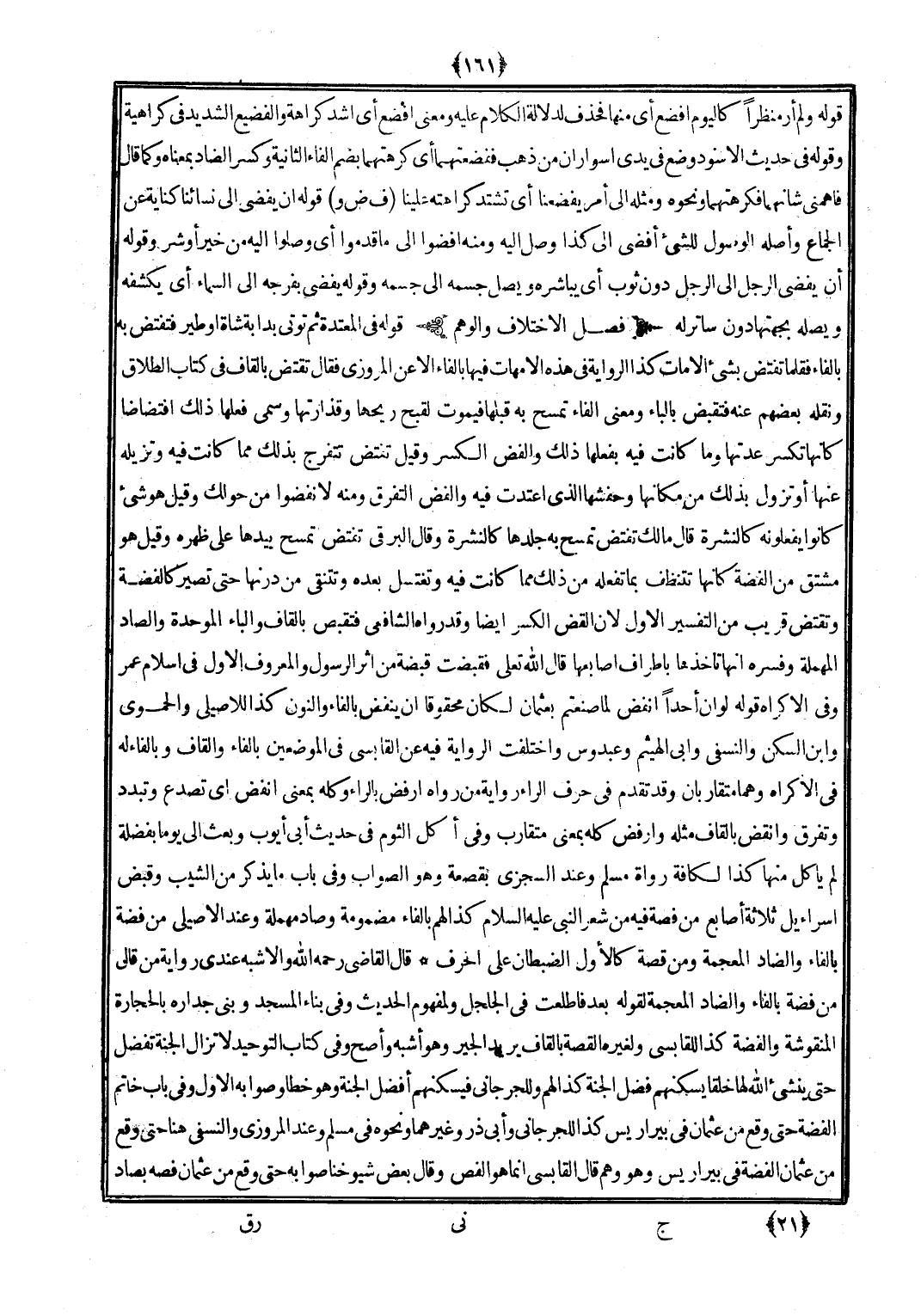 (ف ض و) قَوْله أَن يُفْضِي إِلَى نسائنا كِنَايَة عَن الْجِمَاع وَأَصله الْوُصُول للشَّيْء أفْضى إِلَى كَذَا وصل إِلَيْهِ وَمِنْه افضوا إِلَى مَا قدمُوا أَي وصلوا إِلَيْهِ من خير أَو شَرّ وَقَوله أَن يُفْضِي الرجل إِلَى الرجل دون ثوب أَي يباشره ويصل جِسْمه إِلَى جِسْمه وَقَوله يُفْضِي بفرجه إِلَى السَّمَاء أَي يكشفه ويصله بجهتها دون سَاتِر لَهُ.