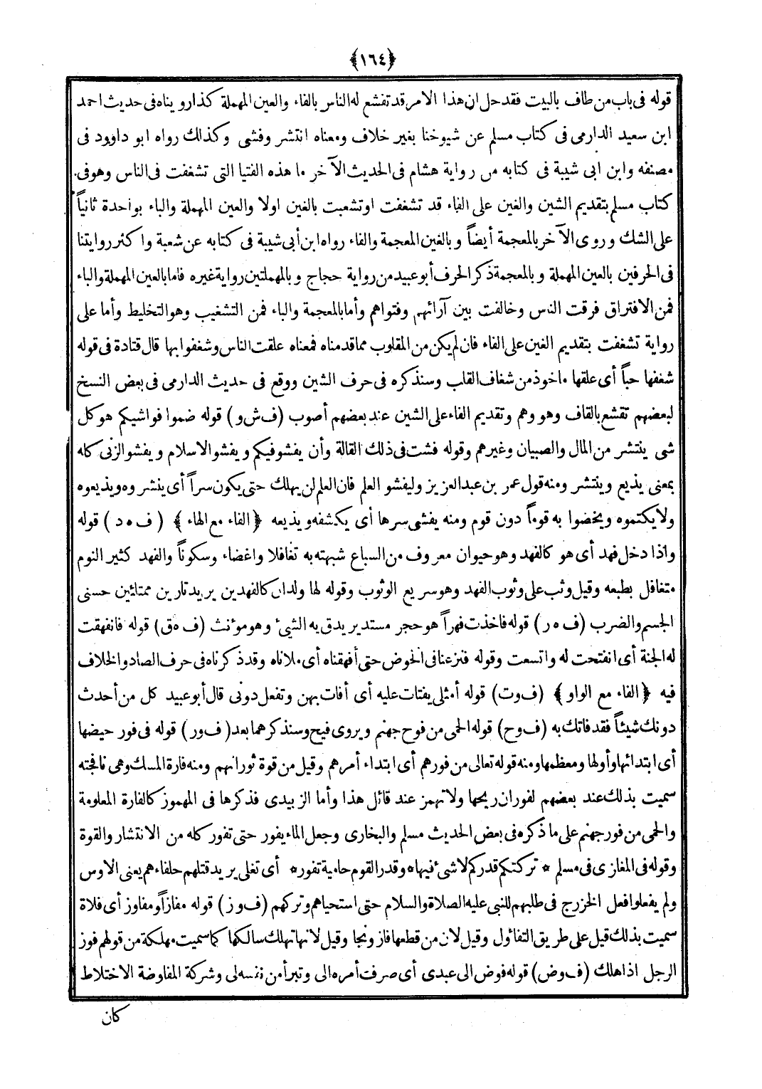 قَوْله فِي بَاب من طَاف بِالْبَيْتِ فقد حل أَن هَذَا الْأَمر قد تفشع لَهُ النَّاس بِالْفَاءِ وَالْعين الْمُهْملَة كَذَا روينَاهُ فِي حَدِيث أَحْمد ابْن سعيد الدَّارمِيّ فِي كتاب مُسلم عَن شُيُوخنَا بِغَيْر خلاف وَمَعْنَاهُ انْتَشَر وفشى وَكَذَلِكَ رَوَاهُ أَبُو دَاوُود فِي مُصَنفه وَابْن أبي شيبَة فِي كِتَابه من رِوَايَة هِشَام فِي الحَدِيث الآخر مَا هَذِه الْفتيا الَّتِي تشغفت فِي النَّاس وَهُوَ فِي كتاب مُسلم بِتَقْدِيم الشين والغين على الْفَاء قد تشغفت أَو تشعبت بالغين أَولا وَالْعين الْمُهْملَة وَالْبَاء بِوَاحِدَة ثَانِيًا على الشَّك وروى الآخر بِالْمُعْجَمَةِ أَيْضا وبالغين الْمُعْجَمَة وَالْفَاء رَوَاهُ ابْن أبي شيبَة فِي كِتَابه عَن شُعْبَة وَأكْثر روايتنا فِي الحرفين بِالْعينِ الْمُهْملَة وبالمعجمة ذكر الْحَرْف أَبُو عبيد من رِوَايَة حجاج وبالمهملتين رِوَايَة غَيره فَأَما بِالْعينِ الْمُهْملَة وَالْبَاء فَمن الِافْتِرَاق فرقت النَّاس وخالفت بَين آرائهم وفتواهم وَأما بِالْمُعْجَمَةِ وَالْبَاء فَمن التشغيب وَهُوَ التَّخْلِيط وَأما على رِوَايَة تشغفت بِتَقْدِيم الْغَيْن على الْفَاء فَإِن لم يكن من المقلوب مِمَّا قدمْنَاهُ فَمَعْنَاه علقت النَّاس وشغفوا بهَا قَالَ قَتَادَة فِي قَوْله شغفها حبا أَي علقها مَأْخُوذ من شغَاف الْقلب وسنذكره فِي حرف الشين وَوَقع فِي حَدِيث الدَّارمِيّ فِي بعض النّسخ لبَعْضهِم تقشع بِالْقَافِ وَهُوَ وهم وَتَقْدِيم الْفَاء على الشين عِنْد بَعضهم أصوب